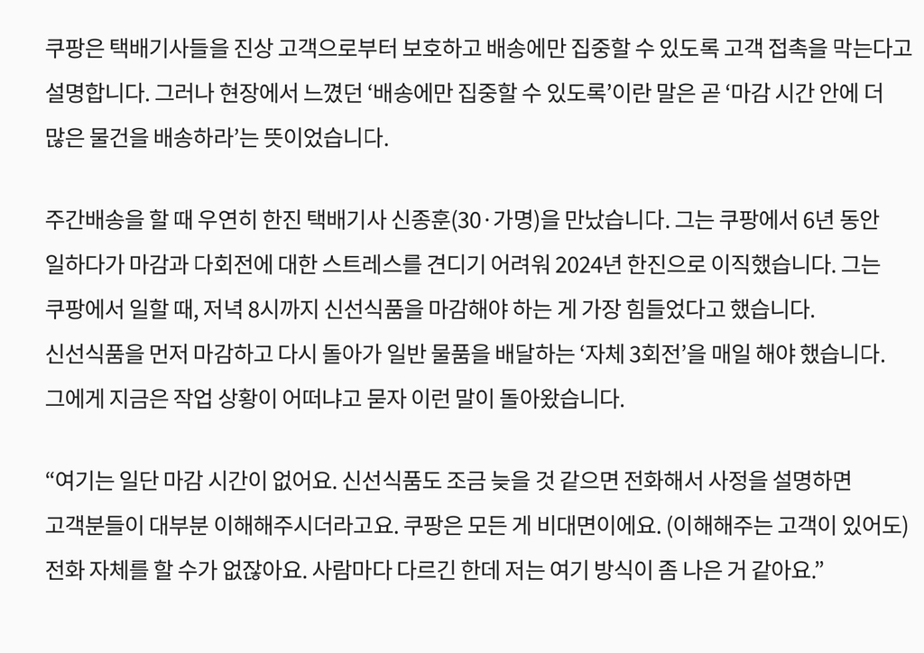 기자가 쿠팡에서 일하면서 어떤 시스템 때문에 힘들었는지에 대해서 집중적으로 썰을 품