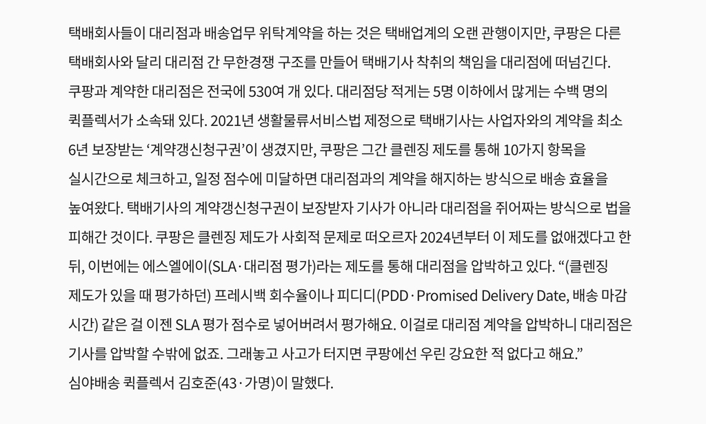 쿠팡과의 재계약을 위해 대리점은 기사들을 압박할 수 밖에 없는 구조라고 함