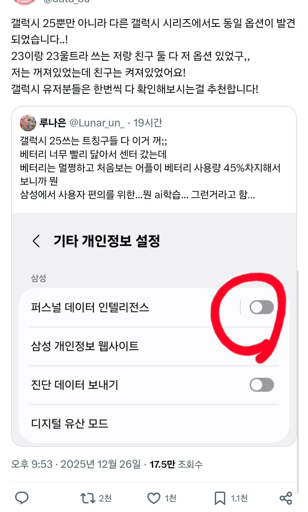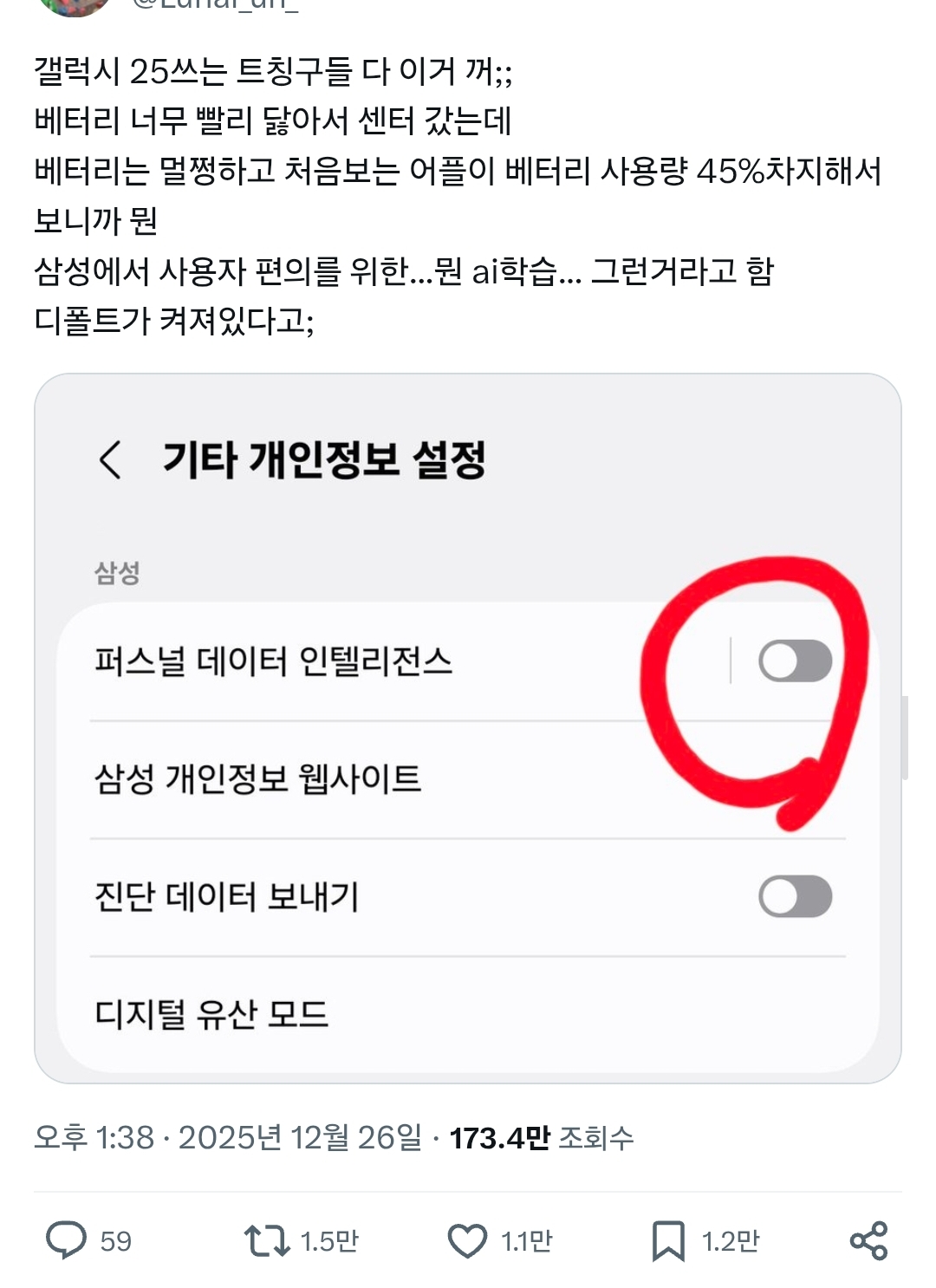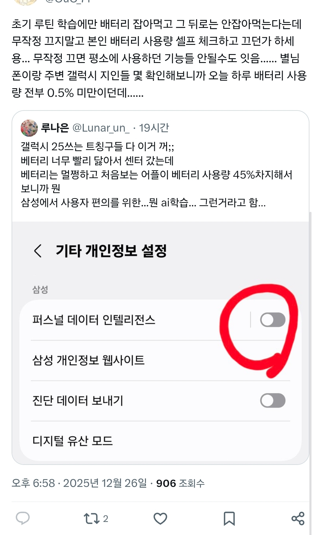 [기타]요즘 배터리 빨리 닳는것 같은 갤럭시 유저들이 한 번씩 확인해봐야할 것.twt 작성자카이지|작성시간25.12.27|조회수73,317 목록 댓글 213 글자크기 작게가 글자크기 크게가 출처: https://x.com/Lunar_un_/status/2004411499742429211?s=20https://x.com/Lunar_un_/status/2004411499742429211?s=20https://x.com/min_moon8/status/2004484539729788961?s=20https://x.com/OuO_71/status/2004491899055526078?s=20나도 s23인데 켜져있었음근데 초기에 많이 먹고 안정화 되면 ㄱㅊ다는 말도 있음 다음검색 현재 게시글 추가 기능 열기 북마크 공유하기 신고 센터로 신고 댓글 댓글 213 댓글쓰기 답글쓰기 댓글 리스트 작성자홍이선 | 작성시간 25.12.29 헐 어쩐지 작성자푱푱하다푱 | 작성시간 25.12.29 머야당장끔 작성자톰히2 | 작성시간 25.12.29 ㅅㅂ 어쩐지 졸라 빨리 닳더라 작성자냇플릭 | 작성시간 25.12.30 1프로도 안되는디... 베터리활동 들어가서 다들 확인해봐~ 그냥 많이써서 닳는겨..ㅎㅎ 작성자천운이따르는자 | 작성시간 25.12.31 ㅁㅊ 어쩐지 댓글 전체보기