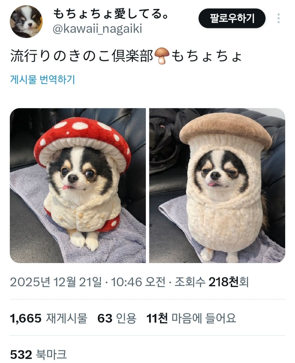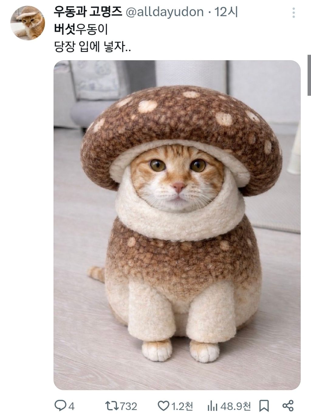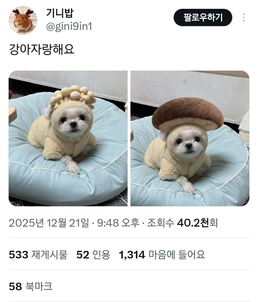 [스크랩] [흥미돋]요즘 트위터에서 유행하고 있다는 버섯 작성자윈스턴|작성시간25.12.27|조회수62,458 목록 댓글 83 글자크기 작게가 글자크기 크게가 출처: 여성시대 윈스턴바로 일본에서 시작된 버섯강쥐들한국도 질 수 없음GPT한테 버섯옷 입혀달라고 하면 된대! 다음검색 스크랩 원문 : *여성시대* 차분한 20대들의 알흠다운 공간 현재 게시글 추가 기능 열기 북마크 공유하기 신고 센터로 신고 댓글 댓글 83 댓글쓰기 답글쓰기 댓글 리스트 작성자bitter melon | 작성시간 25.12.27 으악 댓글 버섯칭긔들 미치게 귀엽다ㅠㅠㅠ 작성자9시20분22도 | 작성시간 25.12.27 졸귀 ㅠ 이미지 확대 작성자오예쑥 | 작성시간 25.12.28 나도해봄 이미지 확대 작성자곰새말이 | 작성시간 25.12.28 이게뭐야 개웃겨 ㅋㄲㅋ 이미지 확대 작성자류 이 안 | 작성시간 25.12.30 ㄱㅇㅇ 이미지 확대 댓글 전체보기