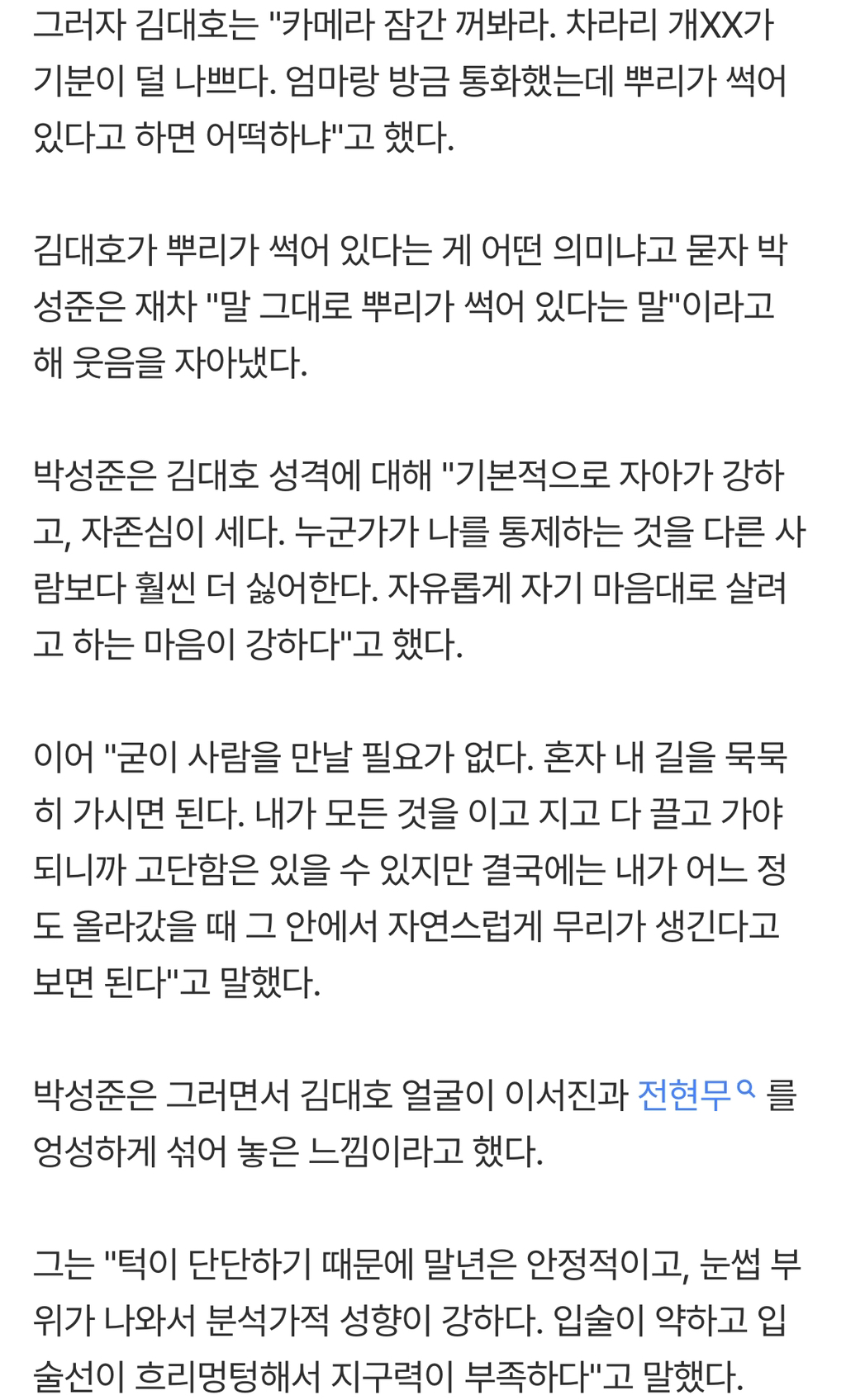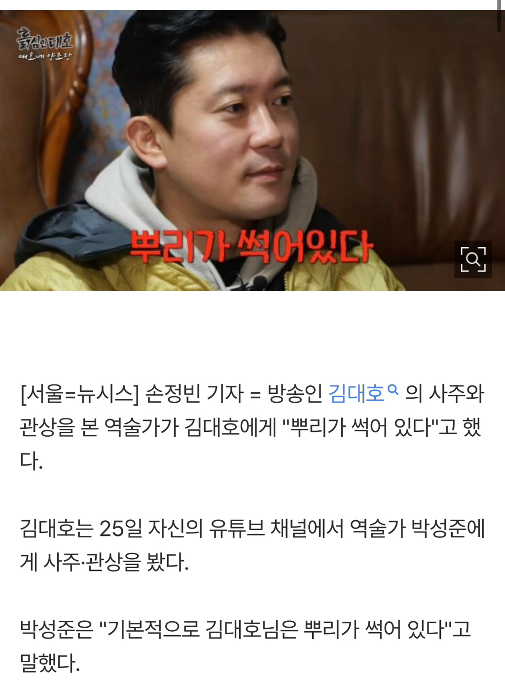 [여시뉴스데스크]김대호 사주·관상 본 역술가 "말 그대로 뿌리가 썩었다" 작성자니나니노니고질라야|작성시간25.12.27|조회수26,689 목록 댓글 40 글자크기 작게가 글자크기 크게가 출처: https://m.entertain.naver.com/home/article/003/0013677597김대호 사주·관상 본 역술가 "말 그대로 뿌리가 썩었다"여기를 눌러 링크를 확인하세요m.entertain.naver.com 다음검색 현재 게시글 추가 기능 열기 북마크 공유하기 신고 센터로 신고 댓글 댓글 40 댓글쓰기 답글쓰기 댓글 리스트 작성자bitter melon | 작성시간 25.12.27 앜ㅋㅋㅋㅋㅋㅋㅋ 면전에서 대놓고 악플 작성자영앤리치리치엥 | 작성시간 25.12.27 이 분 근데 졸라 용해 작성자신비아파트고스트볼x | 작성시간 25.12.27 나혼산만 봐도 주변인 배려를 모르던데..ㄹㅇ 지 기분만 중요한거같음 작성자탬버린해피버스 | 작성시간 25.12.27 아하 늪지대에 둥둥떠있는 나무구만 ,,ㅎ ㅎ...ㅎㅎ 작성자텀블러사면물많이마시려나 | 작성시간 26.01.11 회사어케오래다녁노 댓글 전체보기
