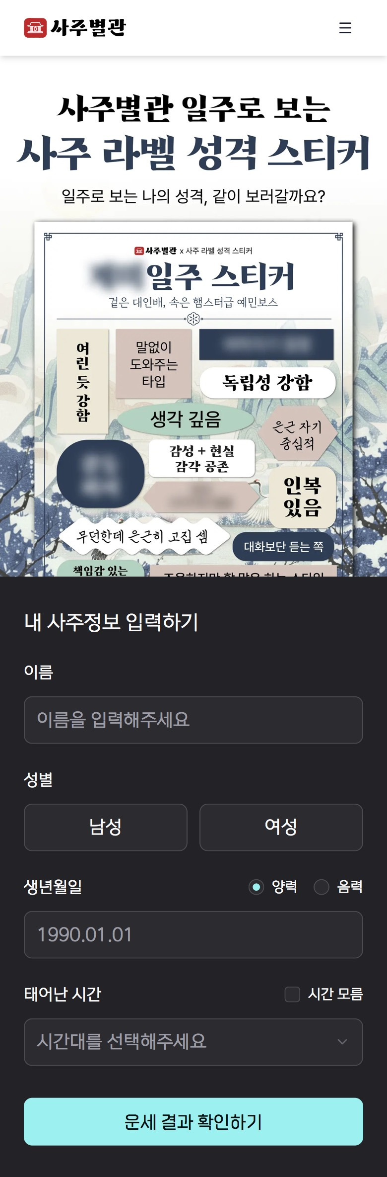 [흥미돋]일주로 보는 사주라벨 성격 스티커 작성자분리배출성애자|작성시간25.12.27|조회수61,482 목록 댓글 332 글자크기 작게가 글자크기 크게가 출처: 여성시대 (분리배출성애자)https://thesajulab.com/100사주별관 사주 라벨 성격 테스트내 일주로 보는 사주 라벨 성격 스티커 : 나의 숨격진 성격 일주로 확인해볼까요?thesajulab.com 해보고 본인이랑 잘 맞는지, 비슷한지 얘기나누자 광고 보면 나와! 다음검색 현재 게시글 추가 기능 열기 북마크 공유하기 신고 센터로 신고 댓글 댓글 332 댓글쓰기 답글쓰기 댓글 리스트 답댓글 작성자꾸리꾸리리 | 작성시간 25.12.29 헐 나랑똑같아 작성자동구리너구리 | 작성시간 25.12.31 미녀동안언변공주병 틀리고 다른건 맞는듯 이미지 확대 작성자나는도대체왜피곤할까 | 작성시간 25.12.31 나존나게으른데 집에만 있음말고는 맞는 것 같기도 이미지 확대 작성자하바바성공시켜주세요 | 작성시간 26.01.03 난 광고없는데 이러면 어떡하죠 이미지 확대 작성자sophon | 작성시간 26.01.05 거의 90프로 이상 맞음 댓글 전체보기