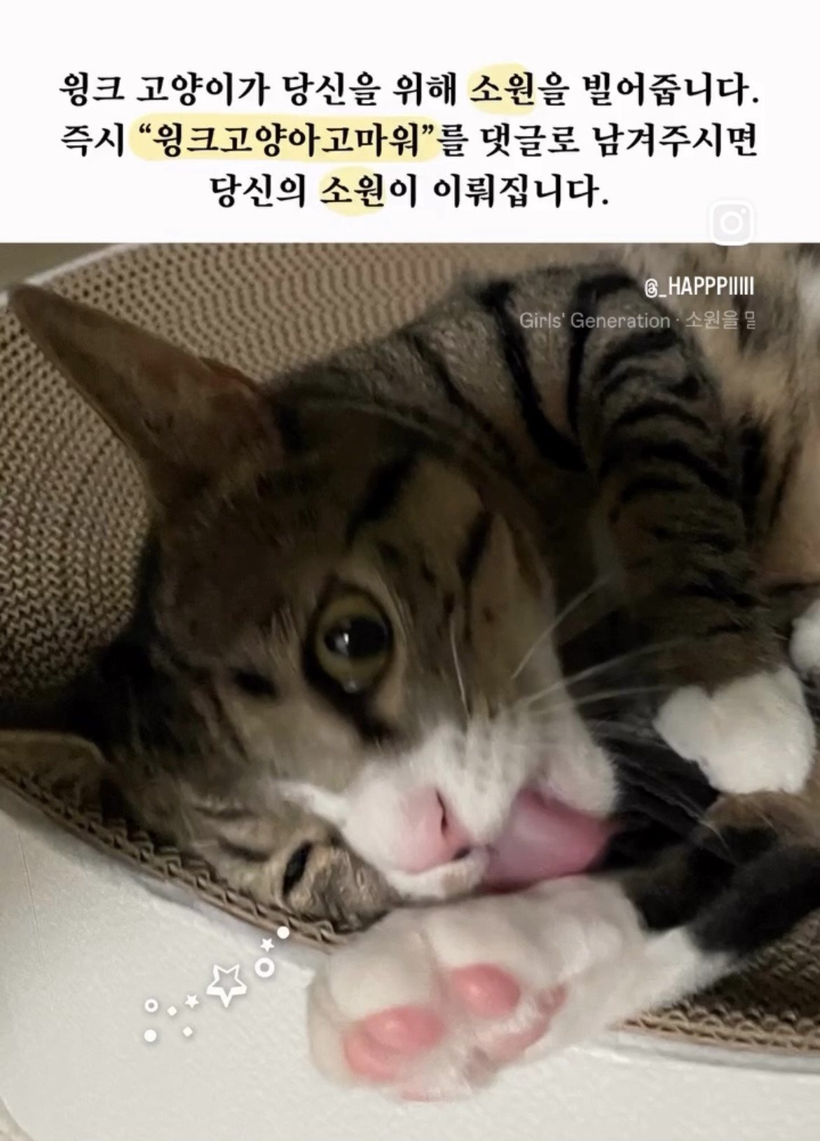 [흥미돋]윙크 고양이가 당신을 위해 소원을 빌어줍니다. 작성자쿨륵|작성시간25.12.27|조회수10,379 목록 댓글 507 글자크기 작게가 글자크기 크게가 출처: 여성시대 (쿨륵)https://www.instagram.com/reel/DSukcwuk03W/윙크고양아고마워2026년 새해 맞이 소원 빌기 다음검색 현재 게시글 추가 기능 열기 북마크 공유하기 신고 센터로 신고 댓글 댓글 507 댓글쓰기 답글쓰기 댓글 리스트 작성자소라고동님 | 작성시간 26.01.01 윙크고양아고마워 ❤️ 작성자다툼이있으면판례에의함 | 작성시간 26.01.08 윙크고양아 고마워 😊 작성자나사 | 작성시간 26.01.08 윙크고양아 고마워 건강해~ 작성자내탓이아니다 | 작성시간 26.01.25 윙크고양아고마워 작성자냥이가세상의주인 | 작성시간 26.01.30 윙크고양아고마워 댓글 전체보기