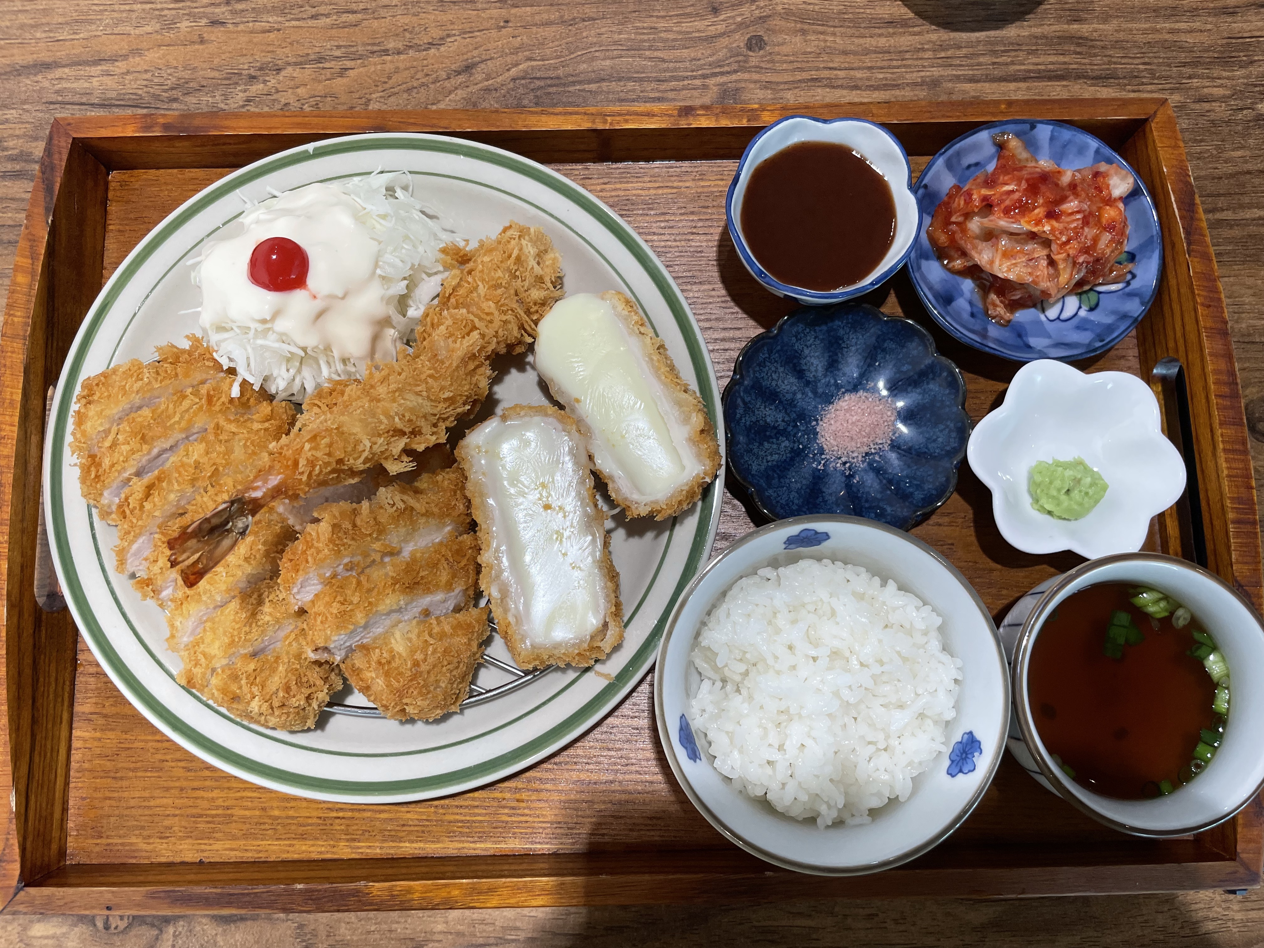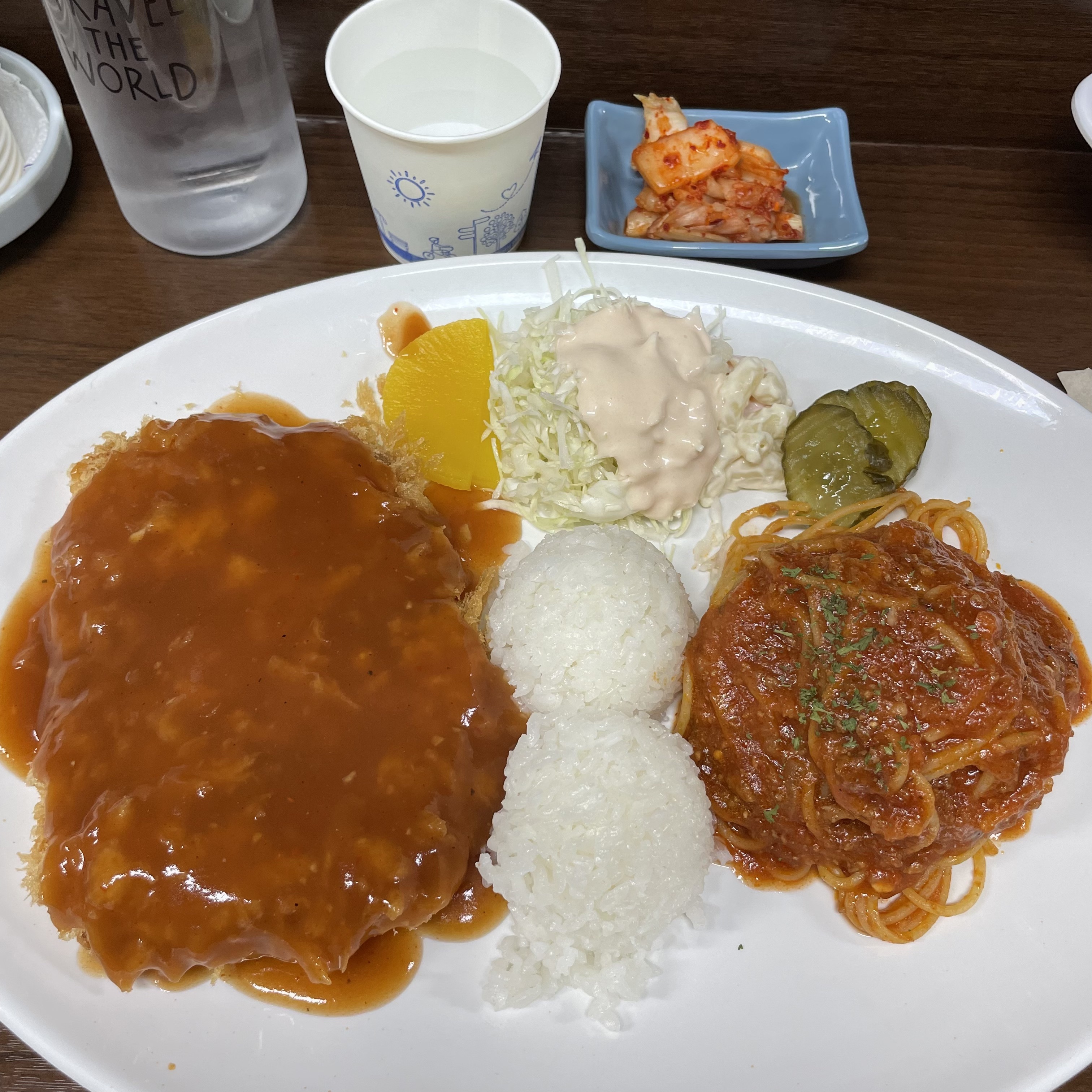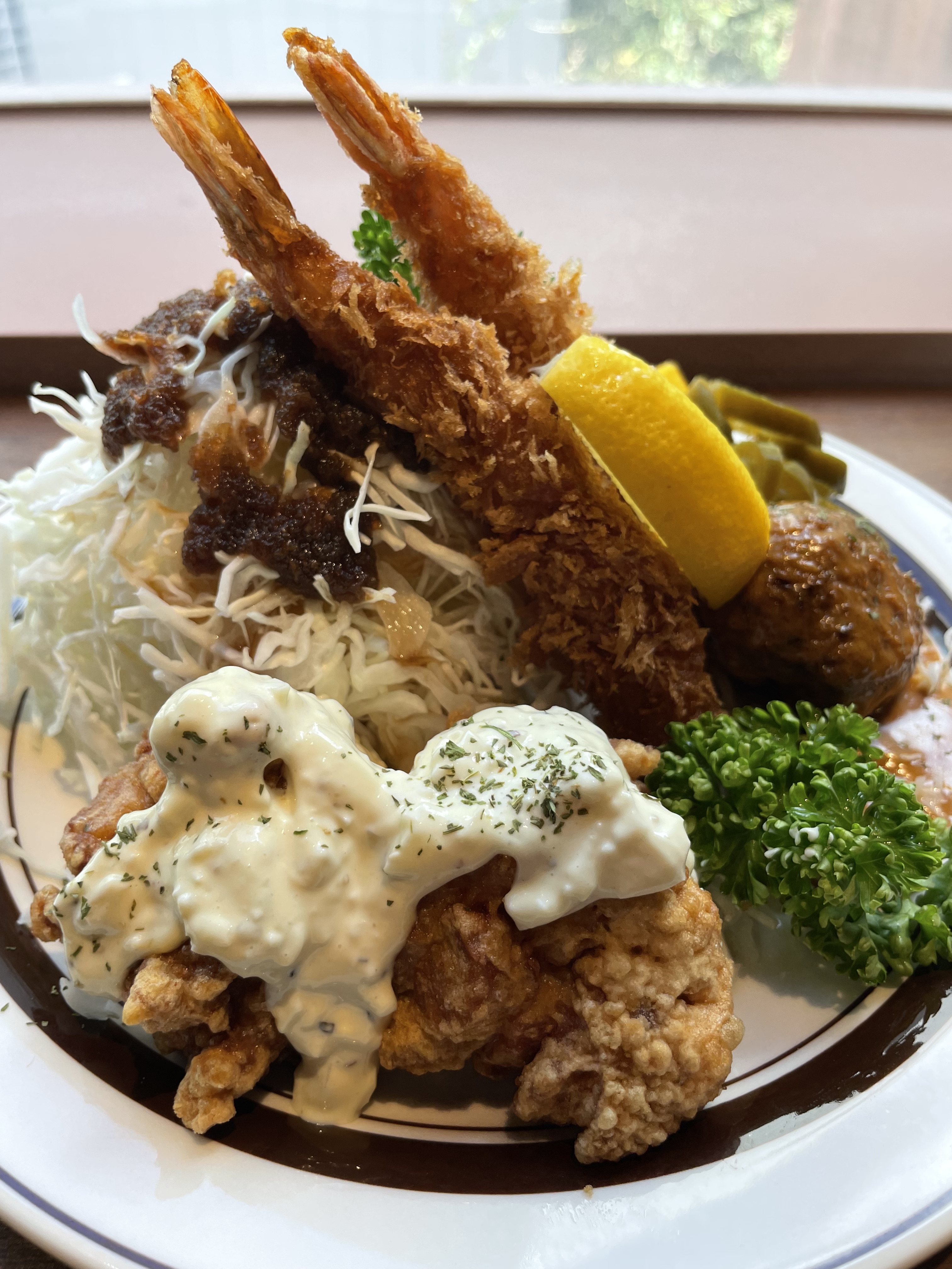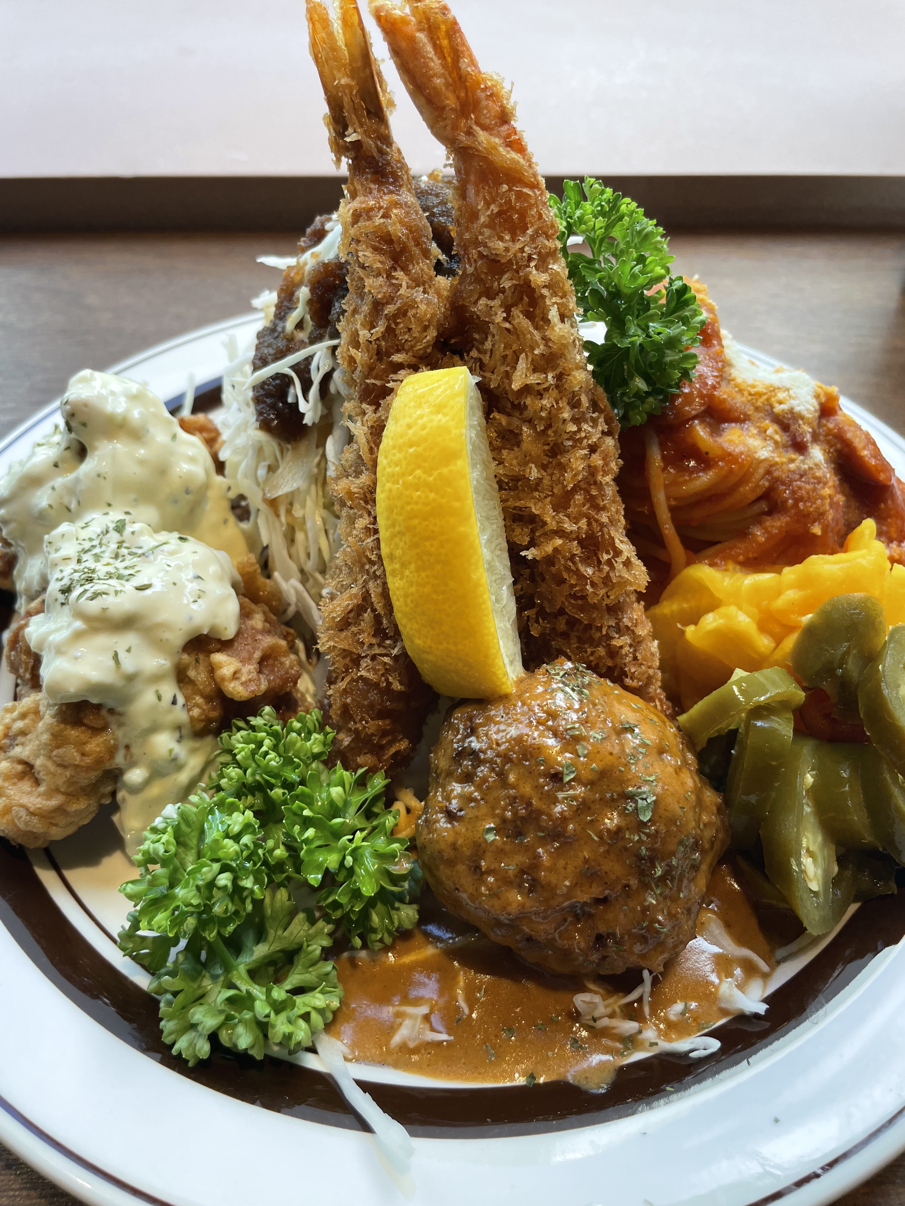 함박스테이크 새우튀김 치킨난반 스파게티로 구성