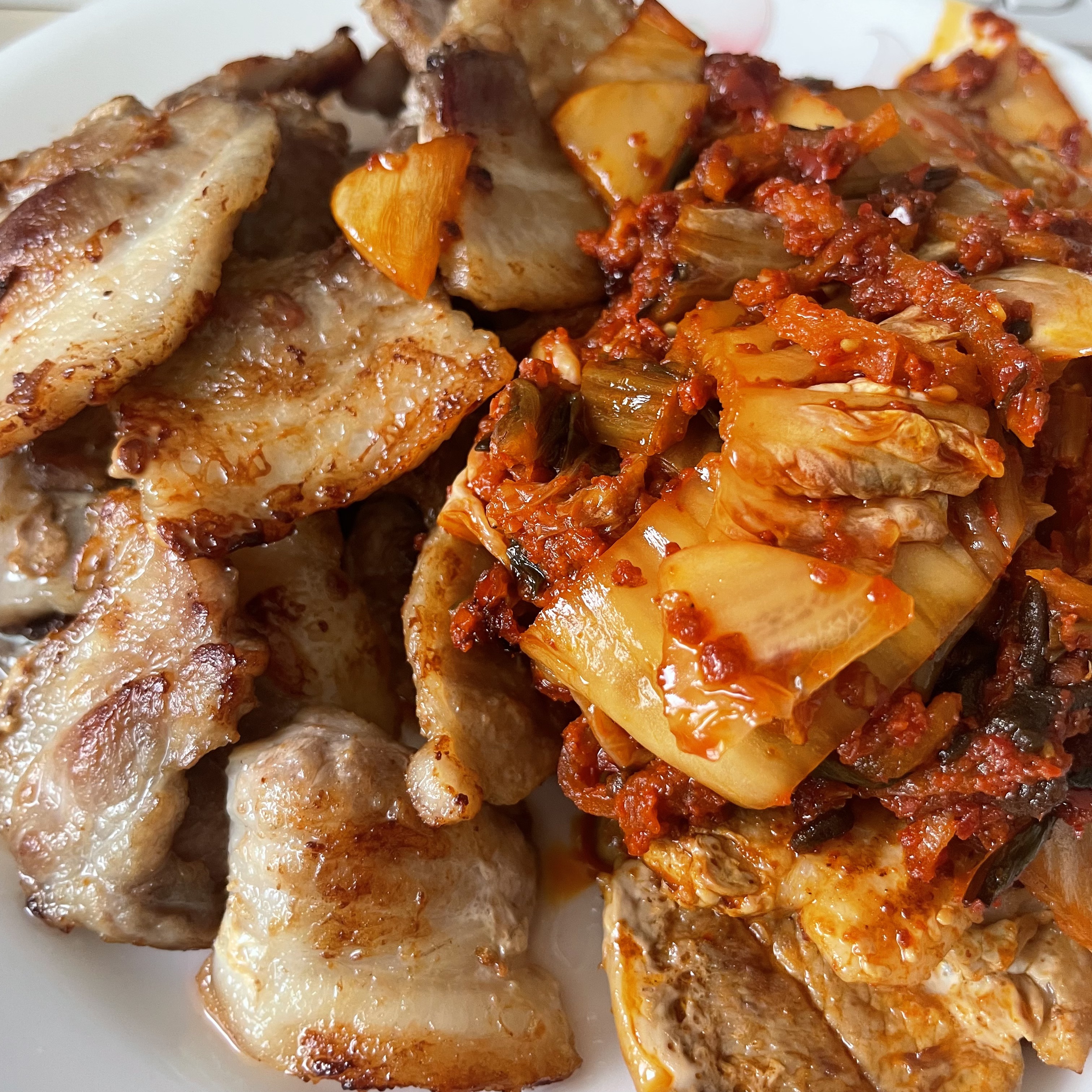 묵은지랑 삼겹살을 같이 구워서 소주뽀개기