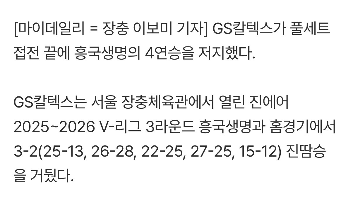 [여시뉴스데스크]드디어 GS 쌍포 터졌다! 실바 45점·레이나 21점...흥국생명 3-2로 꺾고 3위 맹추격 [MD장충] 작성자슈퍼펭귄시리얼|작성시간25.12.27|조회수1,387 목록 댓글 2 글자크기 작게가 글자크기 크게가 출처: https://m.sports.naver.com/volleyball/article/117/0004021206드디어 GS 쌍포 터졌다! 실바 45점·레이나 21점...흥국생명 3-2로 꺾고 3위 맹추격 [MD장충]여기를 눌러 링크를 확인하세요m.sports.naver.com 다음검색 현재 게시글 추가 기능 열기 북마크 공유하기 신고 센터로 신고 댓글 댓글 2 댓글쓰기 답글쓰기 댓글 리스트 작성자CRYING NUT | 작성시간 25.12.27 오늘 경기 존잼 작성자아좋 내힘 들다 | 작성시간 25.12.27 진짜 존잼🫶실바 장군🫶축하해 댓글 전체보기