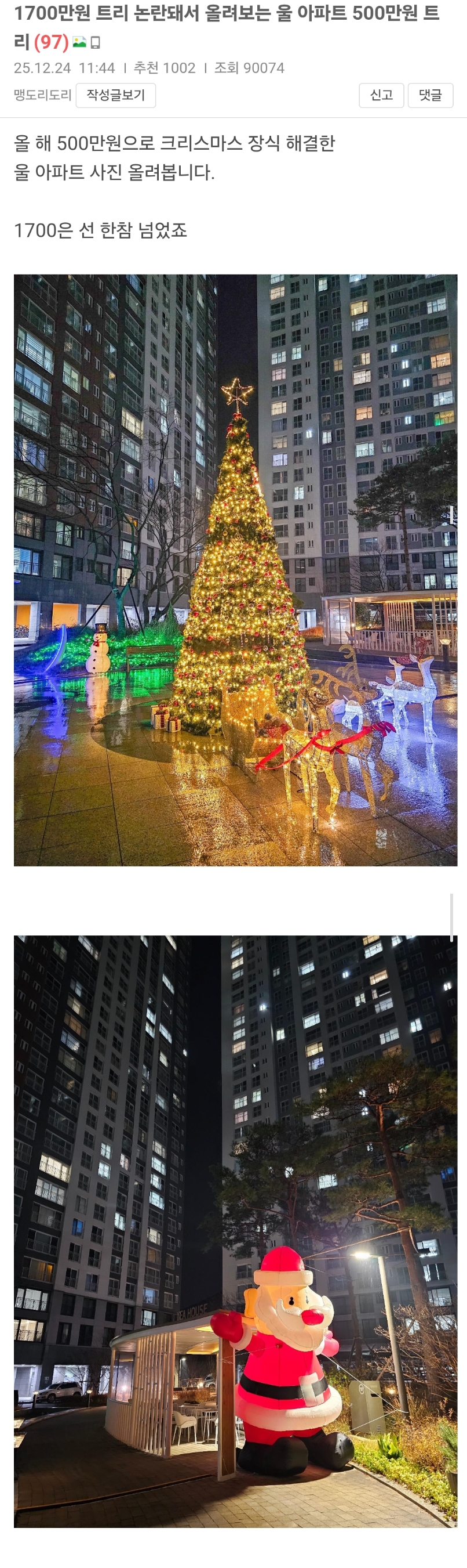 작성자부처님 작성시간 25.12.27 아파트에 저렇게 큰 트리 설치하면 보관은 어디서 어떻게 하는겨? 궁금타 ㅎㅎ