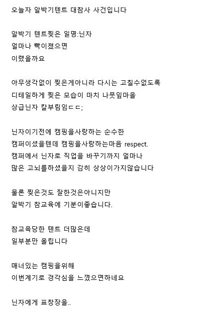 작성자열무비빔면 작성시간 25.12.28 알박기들이면 ㅋㅋㅋㅋ 지들땅도 아닌데 왜 텐트를 상시 쳐놓냐구 ㅋㅋㅋㅋ 의인이시네