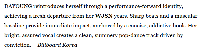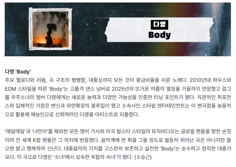 “body는 고품격 댄스 넘버로 2025년의 뜨거운 여름의 열정을 가을까지 연장했고 다영에게는 새로운 능력과 다양한 가능성을 인증한 터닝 포인트가 됐다.”