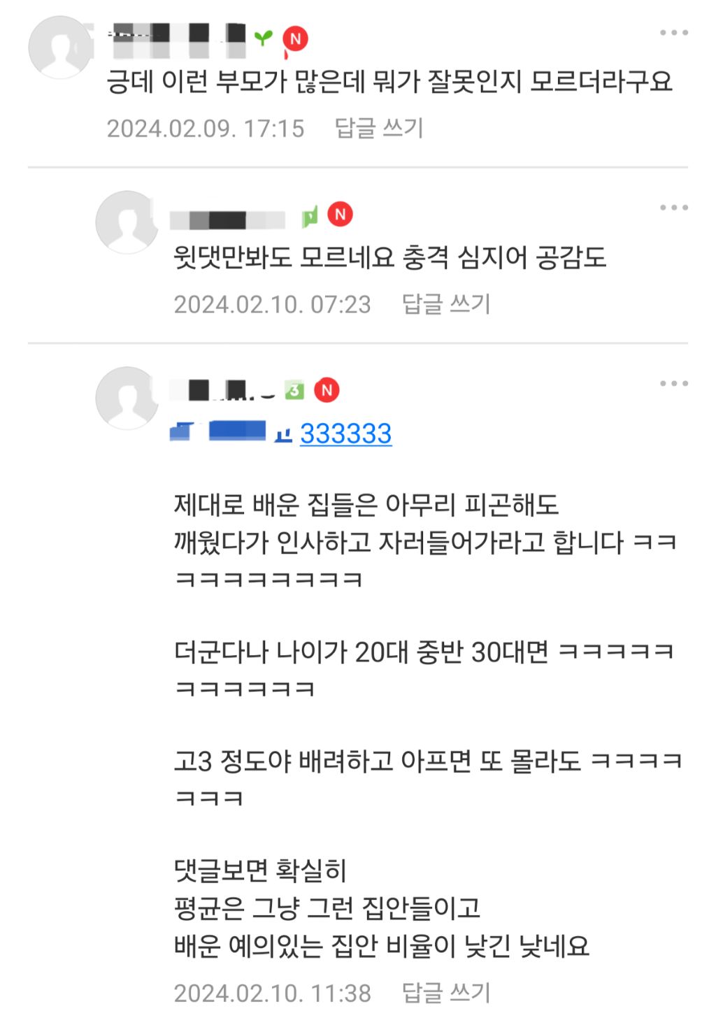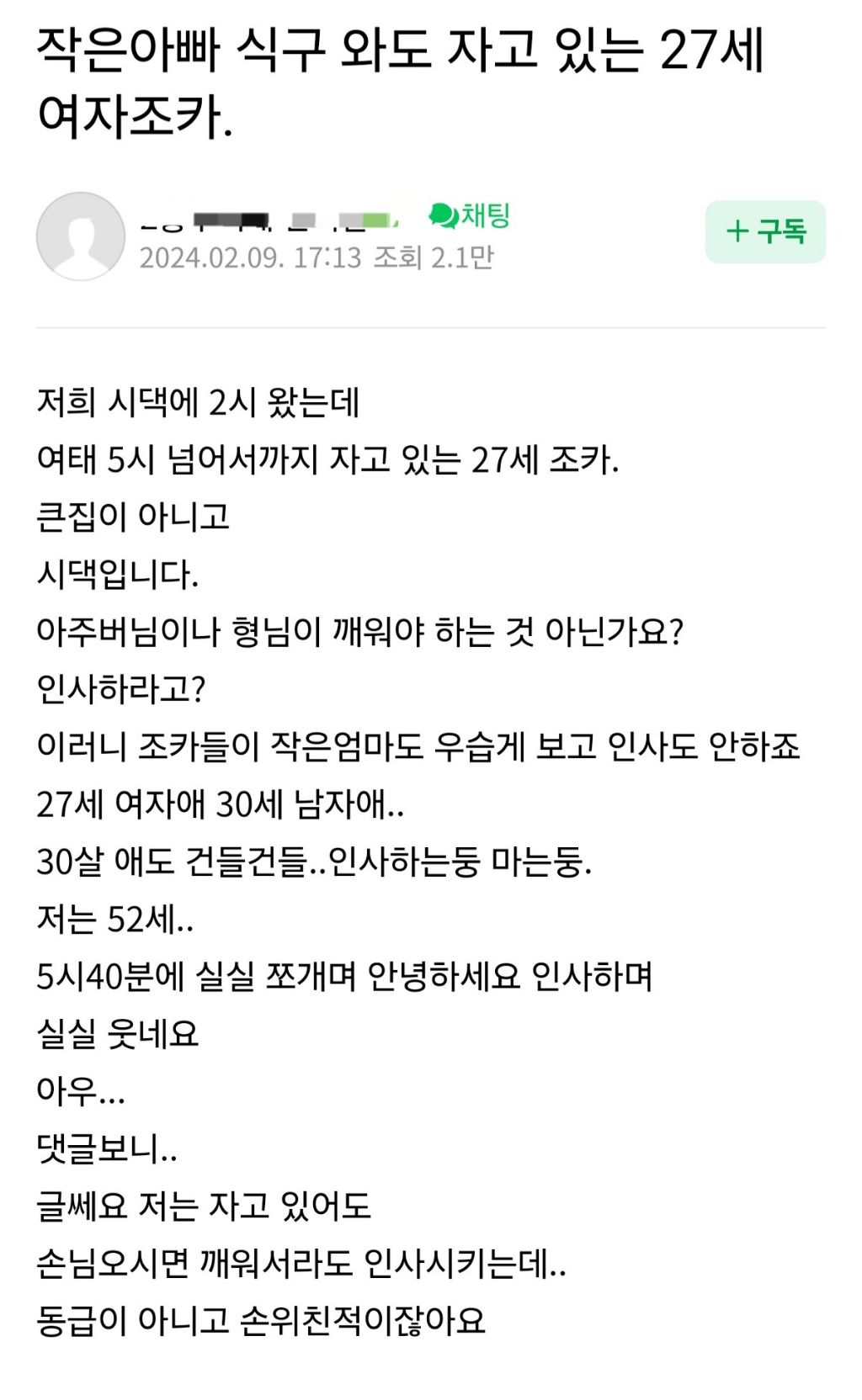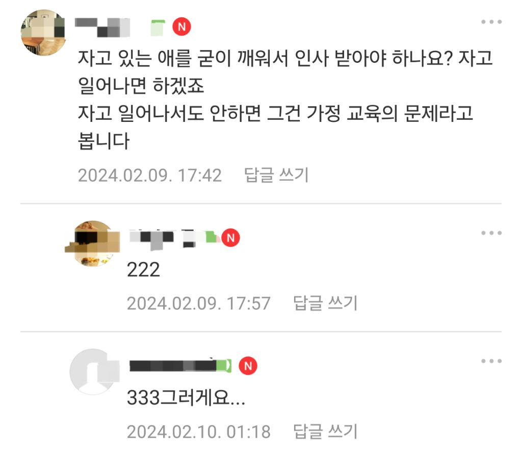 작성자호잉로 작성시간 26.01.04 잉?자느냐 오는줄 몰랐던거 자나..그리고 진짜 피곤한 일있어서 부모도 안깨운걸수도 있고 굳이 뭘 깨워서 까지 인사받고 싶은 마음을 모르겠눈데 ㅋㅋㅋ일어나서 인사했고 자느냐 인사 못한게 가정교육 운운할정도 인가..?인사한 첫째도 대충 인사했다 그런식으로 표현하는거 보면 그냥 아니꼽게 보는거 같은데 ㅋㅋ