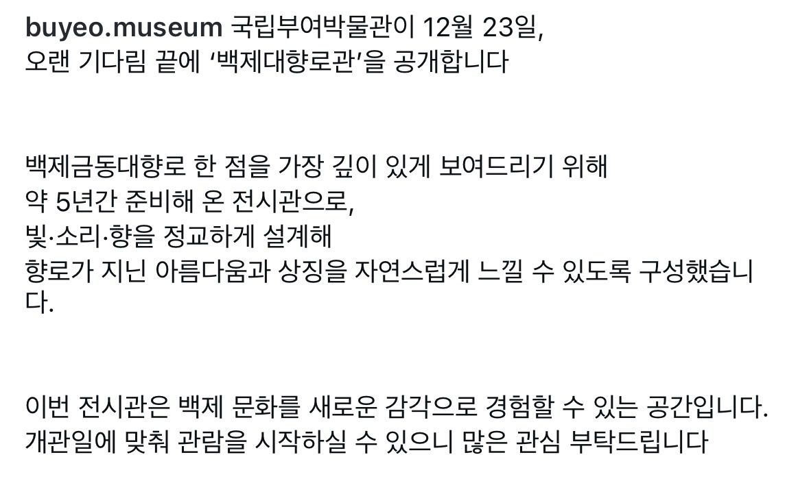 [흥미돋]지금 국립부여박물관 가면 이거 볼수있음 작성자Sunmoonstar02|작성시간25.12.28|조회수39,018 목록 댓글 28 글자크기 작게가 글자크기 크게가 출처: https://www.instagram.com/p/DRynWBAD3LE로그인 • Instagram여기를 눌러 링크를 확인하세요www.instagram.com 다음검색 현재 게시글 추가 기능 열기 북마크 공유하기 신고 센터로 신고 댓글 댓글 28 댓글쓰기 답글쓰기 댓글 리스트 작성자유대하늘다람쥐 | 작성시간 25.12.28 부여 가야겠다 작성자배갚곺파욮 | 작성시간 25.12.28 나도 몇년전에 실제로 봤는데 진짜 신기하고 생각보다 커서 놀랬어 ㅋㅋㅋ 작성자피지오겔 b5ㅕ7 | 작성시간 25.12.28 와 웅장하다 작성자띵킹휴몬 | 작성시간 25.12.28 가야겟다 미틴 작성자멜로망스망스 | 작성시간 25.12.28 얼마전에 다녀왓는데 실제로 보면 영롱함이 미침 ㅋㅋㅋ 간김에 서동한우도 가봐!! 숙성한운데 못 먹어본 한우맛임 ㅋㅋㅋ 이미지 확대 댓글 전체보기