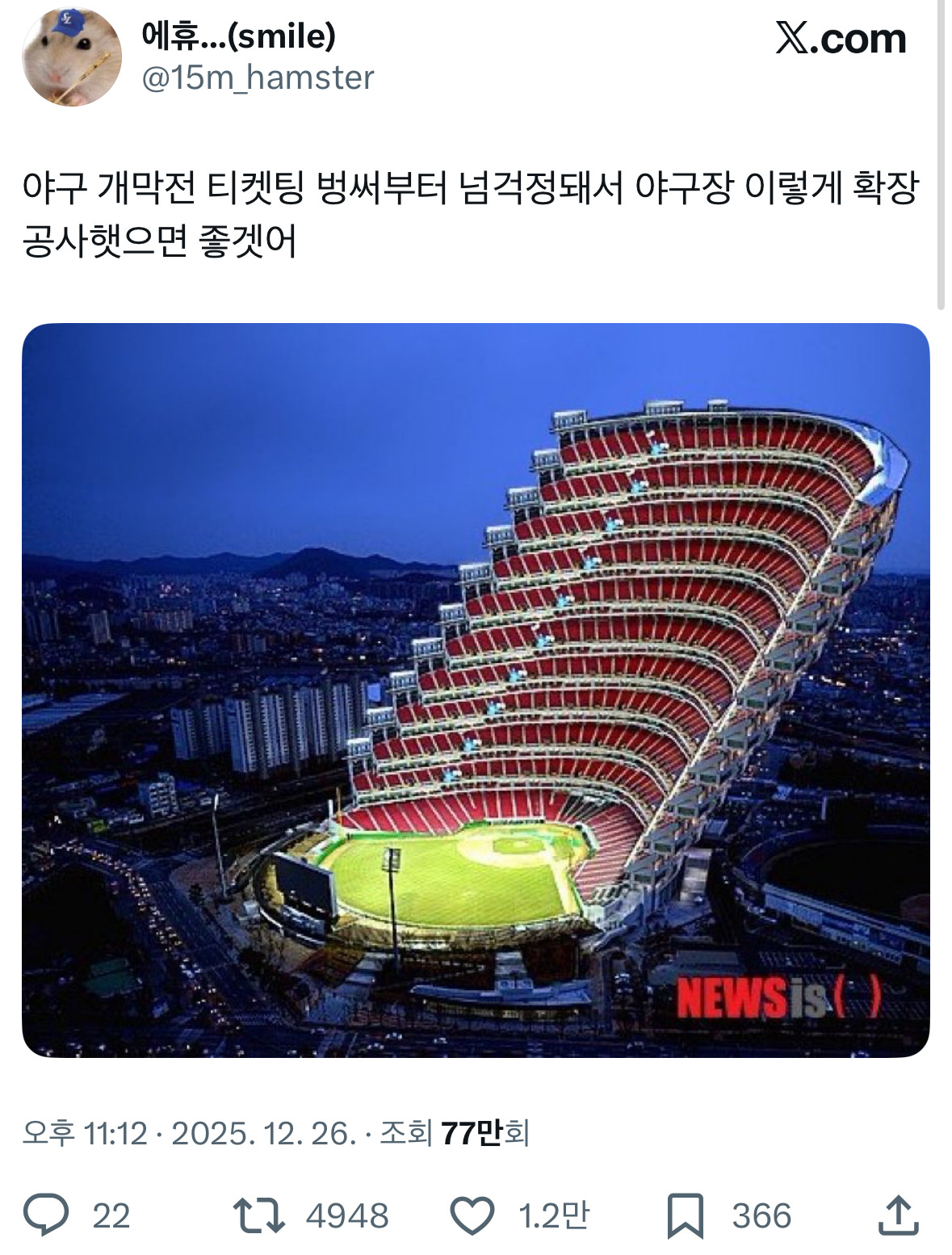 [흥미돋]야구 개막전 티켓팅 벙써부터 넘걱정돼서 야구장 이렇게 확장공사햇으면 좋겟어.x 작성자자경이친구|작성시간25.12.28|조회수17,783 목록 댓글 74 글자크기 작게가 글자크기 크게가 출처: https://x.com/15m_hamster/status/2004555996165980561대신 자리에 응원가는 빵빵하게 들리게 해주소... 다음검색 현재 게시글 추가 기능 열기 북마크 공유하기 신고 센터로 신고 댓글 댓글 74 댓글쓰기 답글쓰기 댓글 리스트 작성자huntr/x | 작성시간 25.12.28 ㅅㅂ ㅋㅋㅋㅋㅋ 작성자우유왕자 | 작성시간 25.12.28 전광판도 안 보일듯ㅅㅂㅋㅋㅋㅋㅋㅋㅋㅋㅋ 작성자Theweeknd | 작성시간 25.12.28 아 내말이^^ 작성자헛소리 금지 | 작성시간 25.12.29 고산병 걸리겐네... 작성자염바디 | 작성시간 25.12.29 롯데팬들은 막 고척 4층에서도 뛰어! 오오오오오 최!강!롯!데! 하시던데 저기서도 뛰실까 궁금해짐 댓글 전체보기