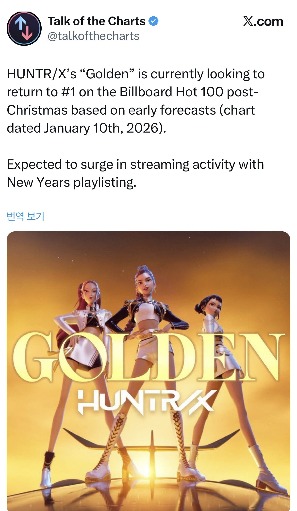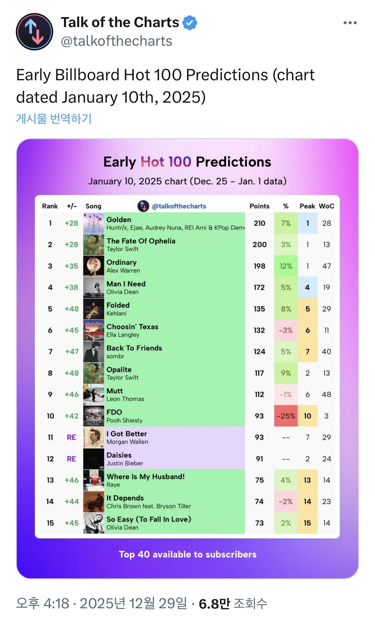 [흥미돋]다음주 빌보드 핫백 1위 예측 뜬 골든 작성자포도알두송이|작성시간25.12.29|조회수18,186 목록 댓글 33 글자크기 작게가 글자크기 크게가 출처: https://theqoo.net/square/4044516982 점수 차이 얼마 안나서 2위나 3위 될 수도 있음 다음검색 현재 게시글 추가 기능 열기 북마크 공유하기 신고 센터로 신고 댓글 댓글 33 댓글쓰기 답글쓰기 댓글 리스트 작성자냉친자 | 작성시간 25.12.29 헐 대박 제발 1등 ㅠㅠ 새해에 1등하면 너무 좋겠다ㅜㅜ 작성자겨울에 태어난 사랑스런 나 | 작성시간 25.12.29 헐 골든 새해 노래로 들어야겠다 작성자최애딸기케이크 | 작성시간 25.12.29 ??? ㄷㄷㄷㄷㄷ아직돞 작성자용감한형사들4 | 작성시간 25.12.29 우와 작성자헤이댓츠미 | 작성시간 25.12.30 미쳤다 댓글 전체보기