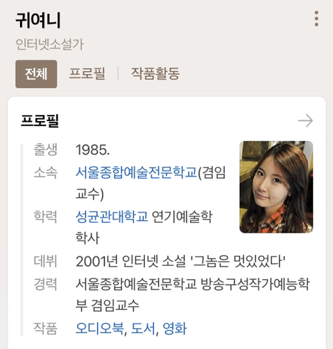 [스크랩] [흥미돋]귀여니가 ‘그놈은 멋있었다’ 집필했을 때 나이 + ‘늑대의유혹’ 영화화 됐을 때 나이 작성자본인 닉네임.|작성시간25.12.29|조회수9,892 목록 댓글 18 글자크기 작게가 글자크기 크게가 출처 :https://m.cafe.daum.net/ok1221/9Zdf/2273747?svc=daumapp&bucket=toros_cafe_channel_beta16살19살 다음검색 스크랩 원문 : *여성시대* 차분한 20대들의 알흠다운 공간 현재 게시글 추가 기능 열기 북마크 공유하기 신고 센터로 신고 댓글 댓글 18 댓글쓰기 답글쓰기 댓글 리스트 작성자폭주기니 | 작성시간 25.12.29 ㄹㅇ 천재.. 작성자ESFP-T | 작성시간 25.12.29 귀여니 천재 작성자이서. | 작성시간 25.12.29 난 저때 공고 상고는 잘생긴얼짱 꼭 있다고 생각했어.. 작성자titfortatㅅㅊ | 작성시간 25.12.29 와 작성자꼬슴도치의 품격 | 작성시간 25.12.30 우아 ㄷ ㄷ 댓글 전체보기
