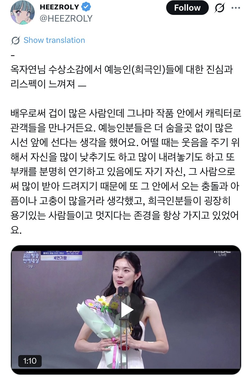 [흥미돋][2025 MBC 방송연예대상] 예능덕후로써 맘이 따뜻해지고 좋았던 수상소감 작성자으춥다|작성시간25.12.30|조회수81,112 목록 댓글 23 글자크기 작게가 글자크기 크게가 출처: https://theqoo.net/square/4045021374더쿠 - [2025 MBC 방송연예대상] 예능덕후로써 맘이 따뜻해지고 좋았던 수상소감여기를 눌러 링크를 확인하세요theqoo.nethttps://x.com/HEEZROLY/status/2005625721834664395?s=20나혼산 옥자연 수상소감 감동개낌https://www.youtube.com/watch?v=4pkw6f3PT3g 다음검색 현재 게시글 추가 기능 열기 북마크 공유하기 신고 센터로 신고 댓글 댓글 23 댓글쓰기 답글쓰기 댓글 리스트 작성자사람됐다짱이지 | 작성시간 25.12.30 왜 악플을..? 작성자존나잘될거임당연ㅇㅇ | 작성시간 25.12.30 왜 욕머근ㄴ거야??? 작성자춘자 | 작성시간 25.12.30 이주승 팬들이 욕 다는거임? 뭔 이주승 왜 안주냐는 댓글이 많이 보이네 에휴... 작성자Solitary | 작성시간 25.12.30 멋있는 언니.... 작성자땅콩실 | 작성시간 25.12.30 악플미쳤다... 댓글 전체보기