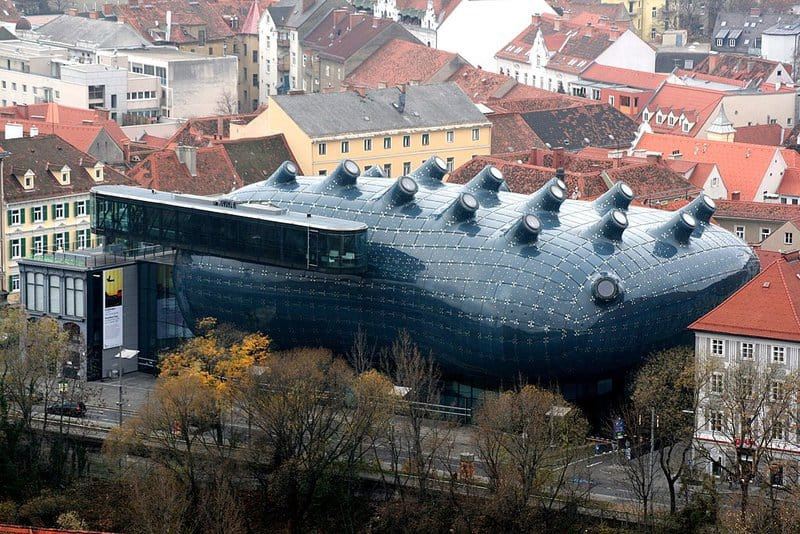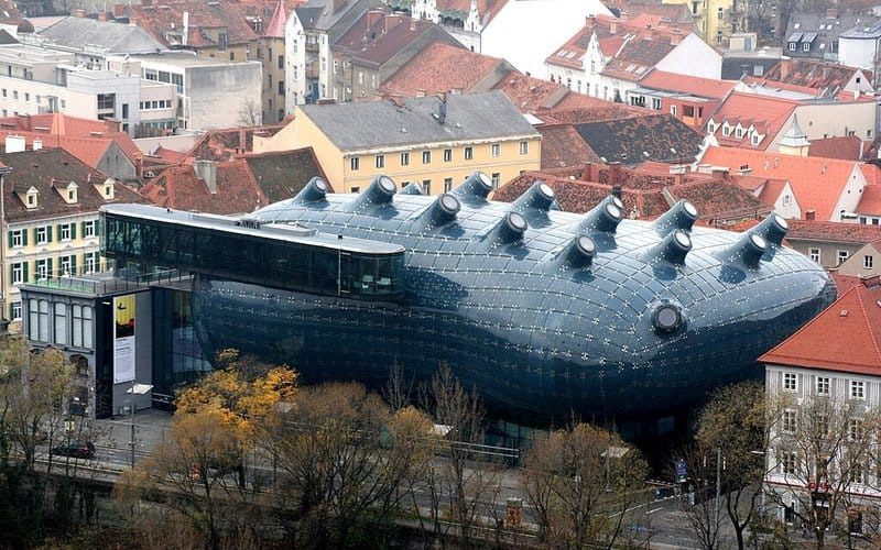 그라츠 중심부, 전통적인 슈타이어 지방 건축 양식이 지배하는 거리 한복판에 현대미술관이 이질적으로 등장한다. ‘친절한 외계인’이라 불리는 그라츠의 쿤스트하우스는 파란색 아크릴 패널로 덮여 있으며, 괴물의 내장을 꺼내 놓은 듯한 인상을 준다. 피터 쿡과 콜린 푸르니에가 설계한 이 건축물은 ‘블롭 건축’의 대표작이다. 블롭 건축은 정사각형이나 직사각형이라는 전통적인 틀에서 벗어나, 불규칙한 곡선과 둥근 형태로 구성된 포스트모던 디자인 양식이다. 이러한 디자인은 컴퓨터 지원 설계(CAD) 기술의 발전 덕분에 가능해졌으며, 쿤스트하우스처럼 독특하고 불가능해 보이는 형태를 구현할 수 있게 되었다. 본질적으로 쿤스트하우스는 특정한 ‘몸체’를 가지지 않은 생명체와 같은 존재이다. 이 충격적인 디자인은 주목을 받기 위한 것이며, 논란을 불러일으키는 것을 목적으로 한다. 그리고 그 목표를 확실히 달성했다.
