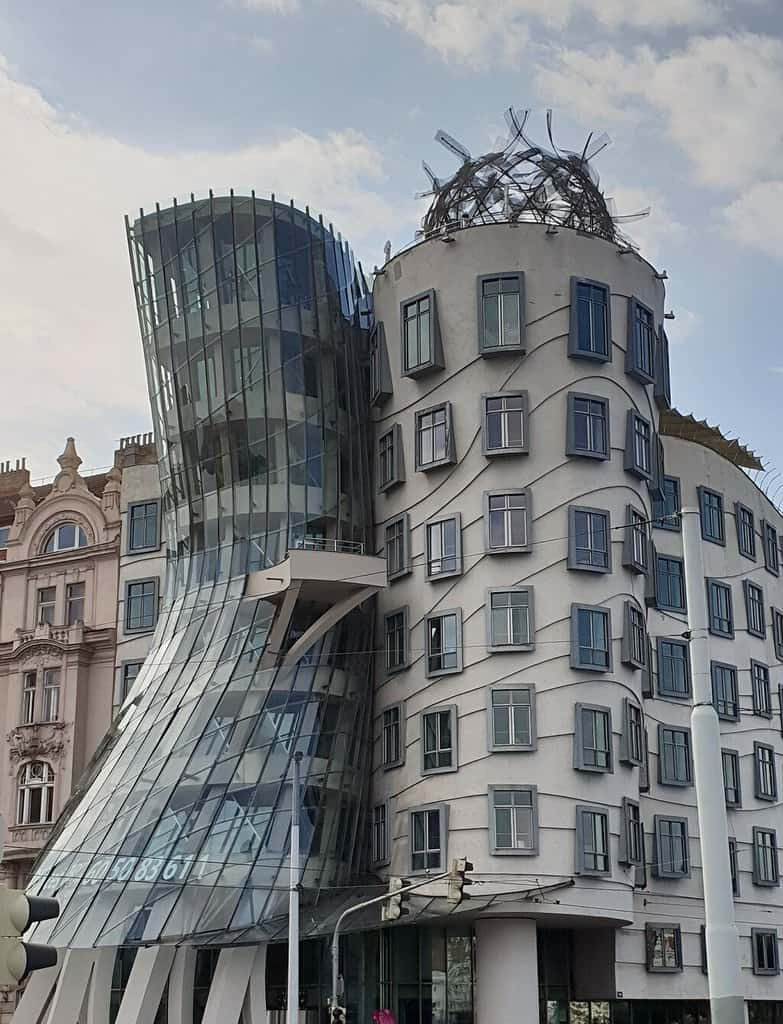 프라하의 고전적인 건축 양식 속에 파도치는 듯한 비대칭 구조의 이 건물이 눈길을 끈다. 크로아티아-체코 건축가 블라도 밀루니치가 유명 건축가 프랭크 게리와 함께 설계했다. 이 부지는 제2차 세계대전 당시 폭격으로 파괴된 주택 터였고, 체코의 지식인으로 후에 대통령이 된 바츨라프 하벨의 이웃 부지였다. 하벨은 이 부지의 개발을 밀루니치에게 의뢰했고, 이후 네덜란드 보험사 네셔널 네덜란덴이 자금을 지원하며, 프랭크 게리와의 협업이 이루어졌다. 두 건축가는 고정된 느낌의 건물과 유동적으로 꼬이는 형태의 건물을 결합해 체코의 공산주의 체제에서 민주주의로의 전환을 상징했다. 주변 건물들과는 확연히 다르지만, 해체주의 건축으로 주목과 찬사를 받고 있다.