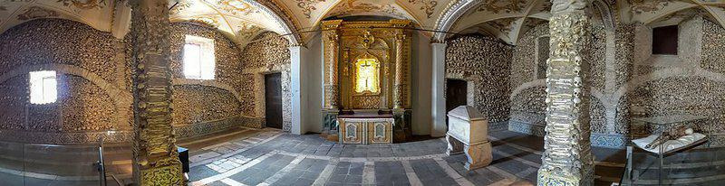 포르투갈 에보라의 가장 오래된 지구, 한때 성벽이었던 고리형 도로 안쪽에는 매우 기이한 방식으로 장식된 예배당이 있다. 충격적인 이 예배당은 사람의 뼈로 뒤덮여 있다. 두개골, 대퇴골, 그 외의 뼈들이 벽면에 예술적으로 배열되어 정교한 무늬를 이루고 있다. 이는 모두 1500년대 프란치스코회 수도사들이 에보라 예배당과 공동묘지를 관리하며, 만든 것이다. 당시 에보라는 심각한 부동산 문제를 겪고 있었고, 시 외곽의 공간이 묘지로 인해 소진되고 있었다. 그러나 수도사들은 시신을 다시 묻는 대신, 뼈를 벽면에 드러내어 시멘트로 고정시켰다. 내부에는 미라화된 시신 두 구도 전시되어 있으며, 한 구는 성인이고 다른 하나는 아동이다. 예배당 내부를 장식한 시신은 약 5,000구로 추정된다. 수도사들은 방문객들이 이 뼈들을 보며, 자신들의 죽음을 성찰하기를 바랐다. 예배당 입구 위에는 이렇게 섬뜩한 문구가 적혀 있다. “여기 있는 우리 뼈는 그대들의 뼈를 기다리고 있노라.”