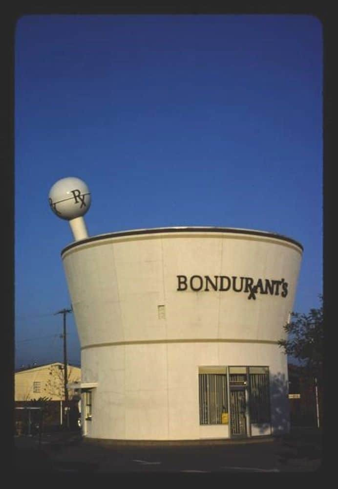 1974년, 약사 조 본두란트는 켄터키주 렉싱턴 시민들에게 약을 제공하는 기능뿐 아니라, 시각적으로도 인상적인 건물을 만들고자 건축가 다니엘 M. 브루어와 협업했다. 이들은 미메틱 형식, 즉 건물이 비건축물처럼 보이도록 만드는 양식을 채택했다. 앞서 언급한 오리 건물이나 슈 하우스처럼, 미메틱 건축은 건물이 어떤 용도로 쓰이는지를 직관적으로 알릴 수 있게 해주며, 동시에 지역 명소로도 기능한다. 본두란트 약국은 절구와 막자사발 모양을 본떠 만들어졌으며, 이는 약사가 약을 직접 조제하던 시절을 상징한다. 현재 이 건물에는 주류 판매점이 입주해 있는데, 새 주인은 이 미메틱 전통을 이어가며, 건물을 거대한 칵테일처럼 보이도록 새롭게 도색했다. 건물 꼭대기에는 마라스키노 체리 장식까지 덧붙였다.