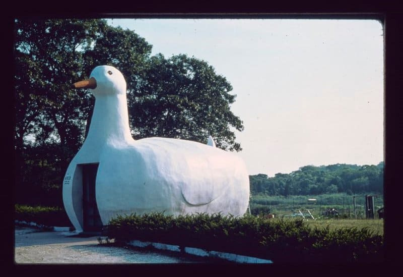오리 농장주 마틴과 줄 마우러 부부는 롱아일랜드 리버헤드의 웨스트 메인 스트리트를 지나는 운전자들로부터 눈길을 끌기 위해 창의적인 아이디어를 냈다. 그들은 캘리포니아에서 본 커피포트 모양의 건물을 본 뒤, 오리 모양의 건물이 주목을 끌기에 적합하다고 판단했다. 빅 덕은 그 시대의 미메틱 건축 운동을 대표하는 예로, 이는 비건축적 사물(커피포트, 동물, 비행기 등)을 건축물로 형상화하는 방식이다. 이 건축양식은 고객의 관심을 끌기 위해 흔히 사용되었다. 이후 플랜더스로 이전되고 몇 차례 소유주가 바뀐 끝에, 1987년 서퍽 카운티에 기증되었고, 지금은 오리 관련 기념품 가게이자 관광 센터로 활용되고 있다.