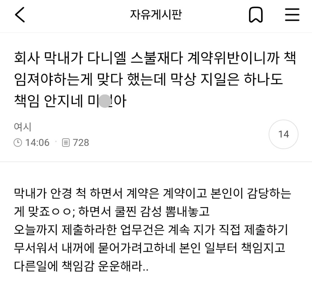 [흥미돋]회사 막내가 다니엘 스불재다 계약위반이다 책임져야하는게 맞다 했는데 막상 지일은 하나도 책임 안지네 작성자아우라ㅏ|작성시간25.12.30|조회수21,767 목록 댓글 73 글자크기 작게가 글자크기 크게가 출처: 여성시대 아우라ㅏ 다음검색 현재 게시글 추가 기능 열기 북마크 공유하기 신고 센터로 신고 댓글 댓글 73 댓글쓰기 답글쓰기 댓글 리스트 작성자에에에에에에에엥 | 작성시간 25.12.30 안경 척 작성자폭망(I Like You) | 작성시간 25.12.30 ㅅㅂㅋㅋㅋㅋㅋㅋㅋㅋㅋㅋㅋㅋㅋㅋㅋㅋ 작성자아름답고미윤새 | 작성시간 25.12.31 ㅋㅋㅋㅋㅋㅋㅋㅋㅋㅋㄹㅇ현대예술이다 작성자소고기먹었지롱 | 작성시간 25.12.31 진짜 너나 잘하세요 증말... 작성자우난우이 | 작성시간 26.01.01 ㅋㅋㅋㅋㅋㅋㅋㅋ아 진짜 길티 본인 일이나 제대로 하셔 댓글 전체보기