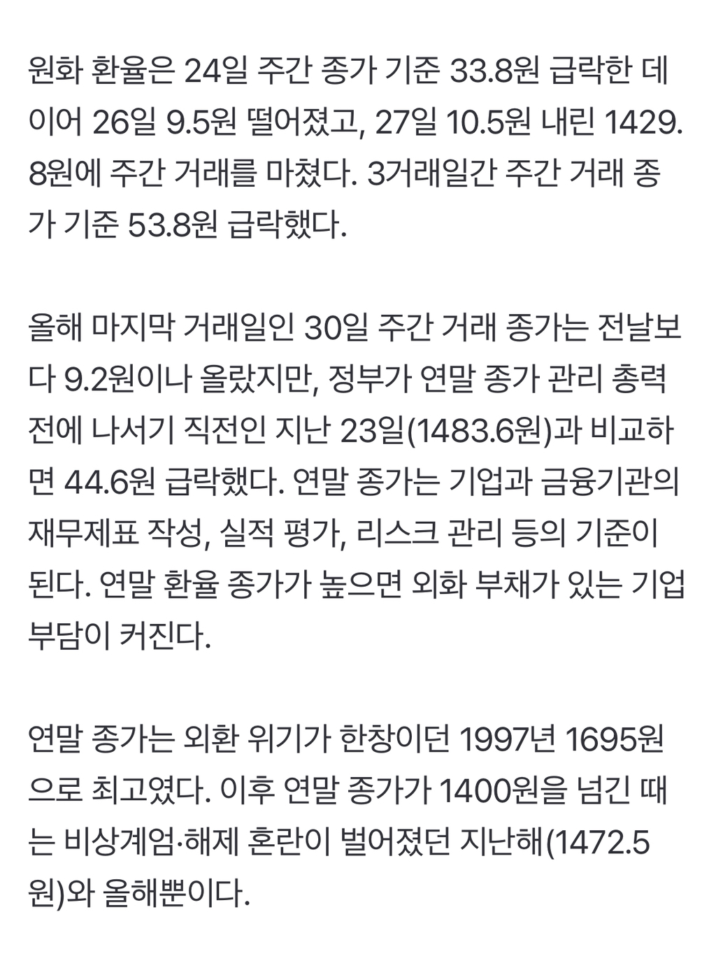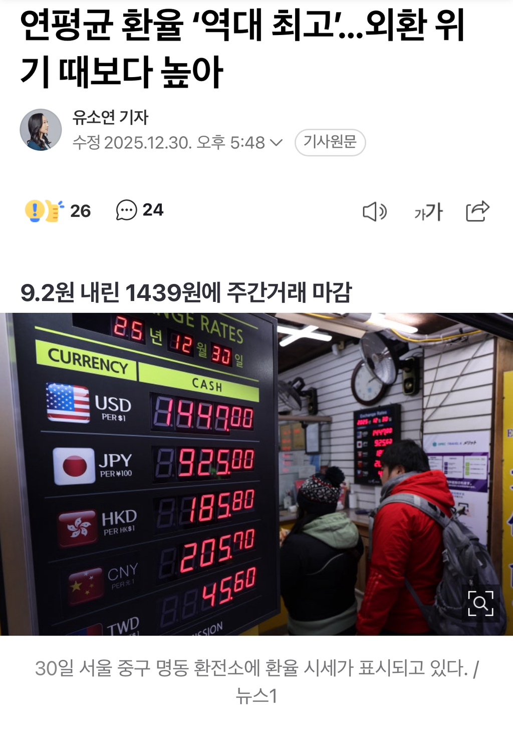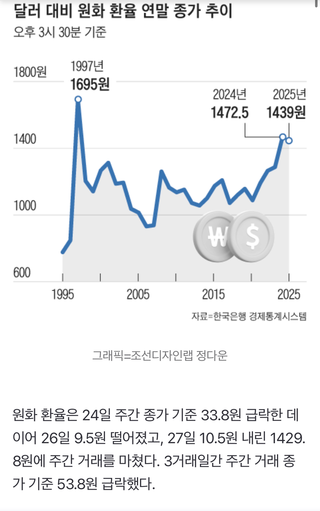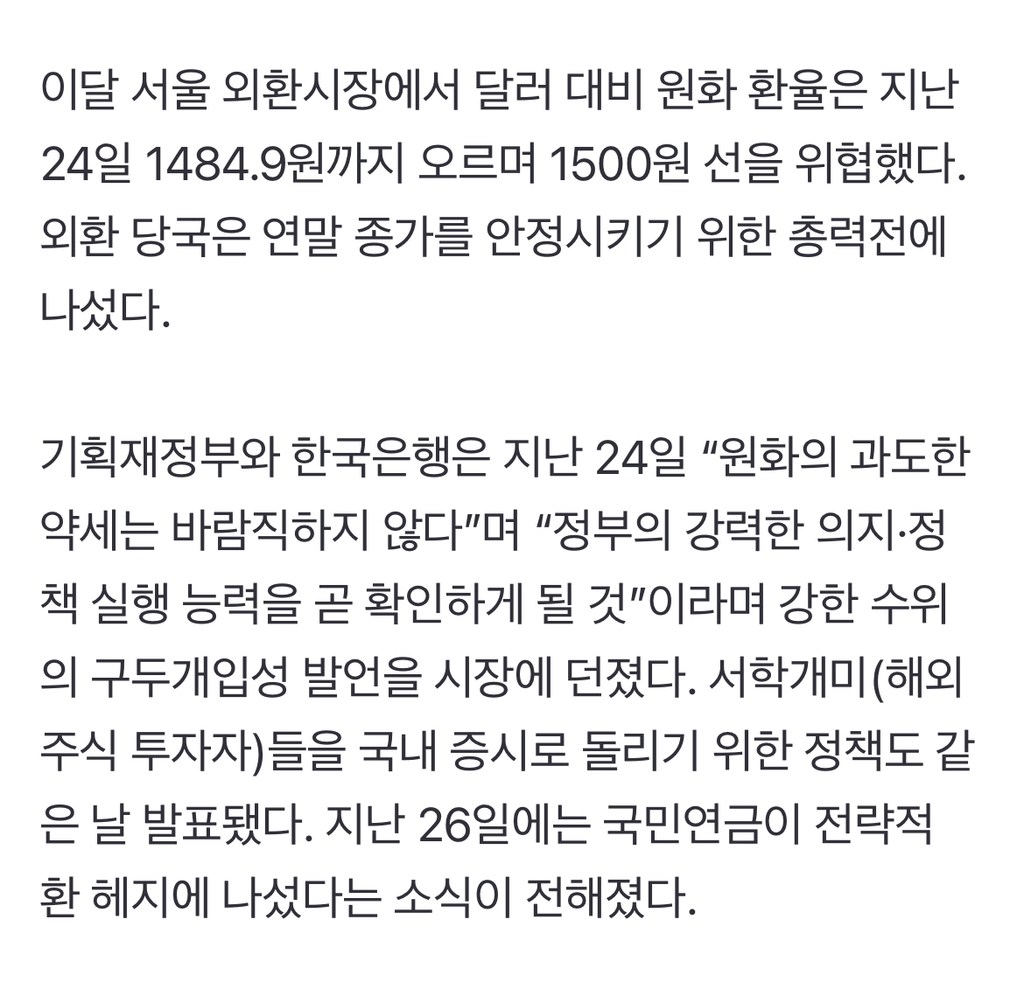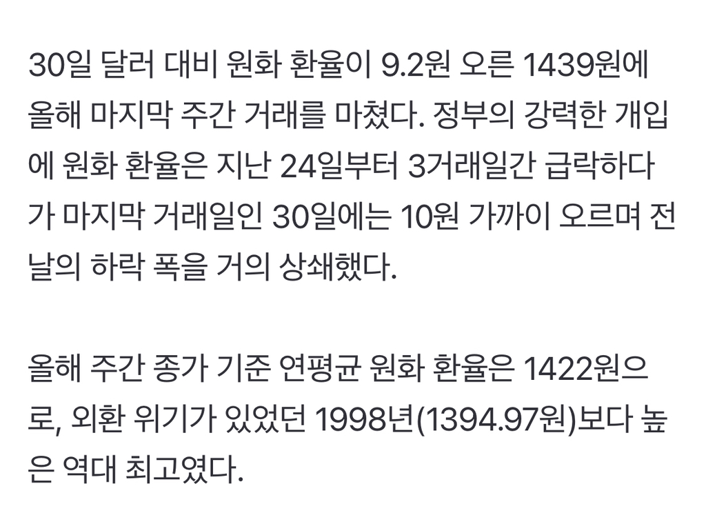 [여시뉴스데스크]연평균 환율 ‘역대 최고’...외환 위기 때보다 높아 작성자visvim|작성시간25.12.30|조회수3,855 목록 댓글 3 글자크기 작게가 글자크기 크게가 출처: https://n.news.naver.com/article/023/0003949943?sid=101연평균 환율 ‘역대 최고’...외환 위기 때보다 높아9.2원 내린 1439원에 주간거래 마감 30일 달러 대비 원화 환율이 9.2원 오른 1439원에 올해 마지막 주간 거래를 마쳤다. 정부의 강력한 개입에 원화 환율은 지난 24일부터 3거래일간 급락하다가 마지n.news.naver.comㅈㅅ기사 클릭은 ㄴㄴ 다음검색 현재 게시글 추가 기능 열기 북마크 공유하기 신고 센터로 신고 댓글 댓글 3 댓글쓰기 답글쓰기 댓글 리스트 작성자포도알두송이 | 작성시간 25.12.30 에휴,, 작성자visvim 작성자 본인 여부 작성자 | 작성시간 25.12.30 내년엔 진짜 달러 환율 안정되면 좋겠다ㅜ 벌써부터 체감되기 시작하는 물가 상승이 너무 걱정됩니다…. 작성자070shake | 작성시간 25.12.30 금리올려라 썅 댓글 전체보기