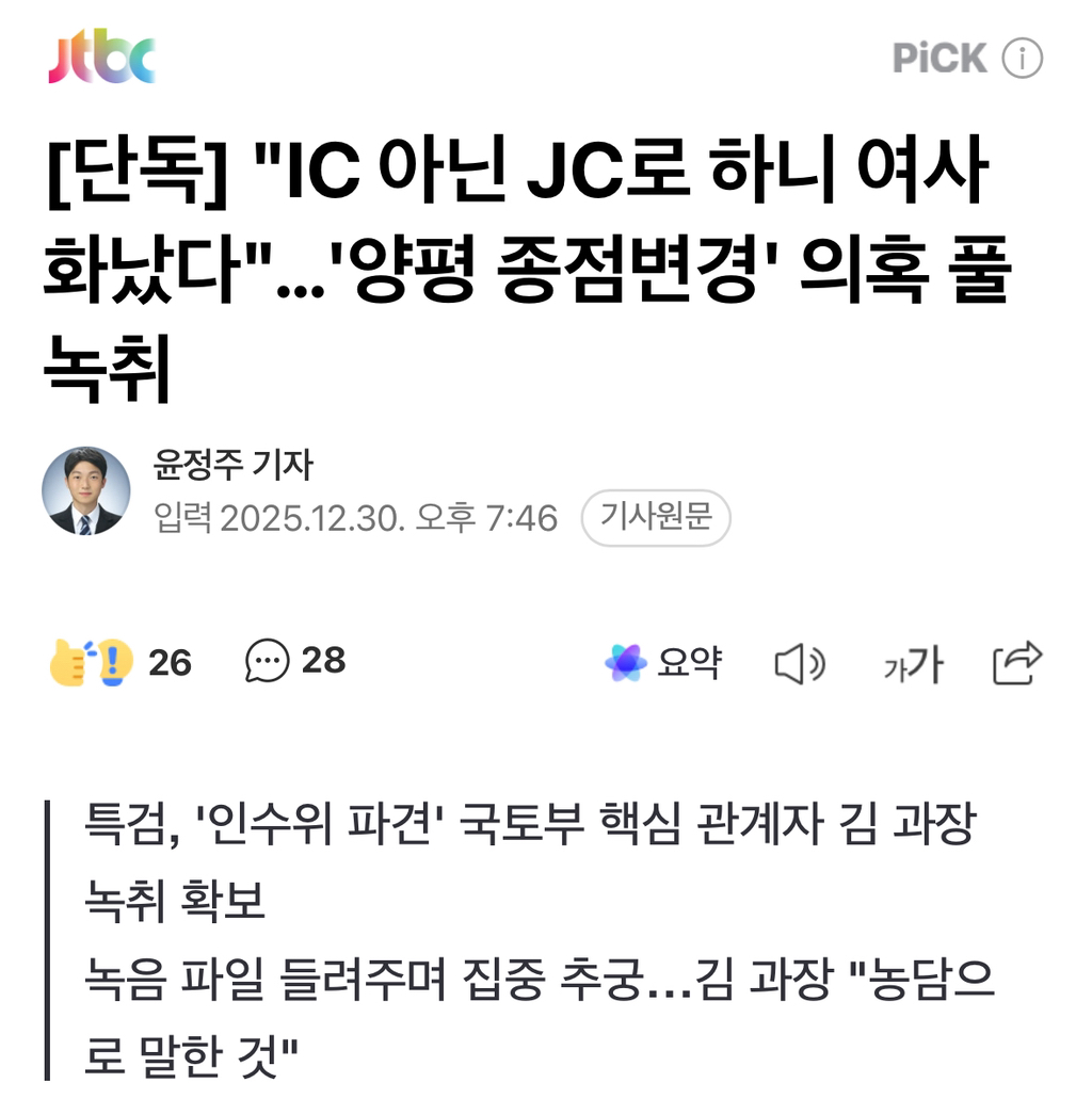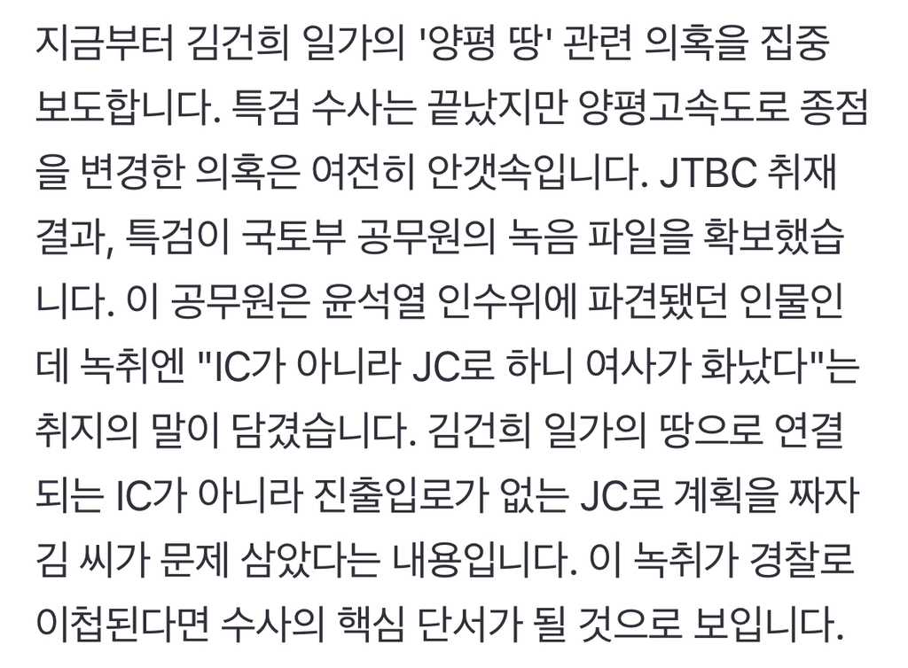 [여시뉴스데스크][단독] "IC 아닌 JC로 하니 여사 화났다"…'양평고속도로 종점변경' 의혹 풀 녹취 작성자소리앙|작성시간25.12.30|조회수1,653 목록 댓글 2 글자크기 작게가 글자크기 크게가 출처: https://naver.me/Fiv7guXJ[단독] "IC 아닌 JC로 하니 여사 화났다"…'양평 종점변경' 의혹 풀 녹취지금부터 김건희 일가의 '양평 땅' 관련 의혹을 집중 보도합니다. 특검 수사는 끝났지만 양평고속도로 종점을 변경한 의혹은 여전히 안갯속입니다. JTBC 취재 결과, 특검이 국토부 공무원의 녹음 n.news.naver.com전문출처 다음검색 현재 게시글 추가 기능 열기 북마크 공유하기 신고 센터로 신고 댓글 댓글 2 댓글쓰기 답글쓰기 댓글 리스트 작성자7ㅇㅇ | 작성시간 25.12.30 Cxxx8 양평군민 이 부부때문에 존나 빡치네요 작성자아흐레 | 작성시간 25.12.30 아니 이게 왜 이제 나오냐고!!! 댓글 전체보기