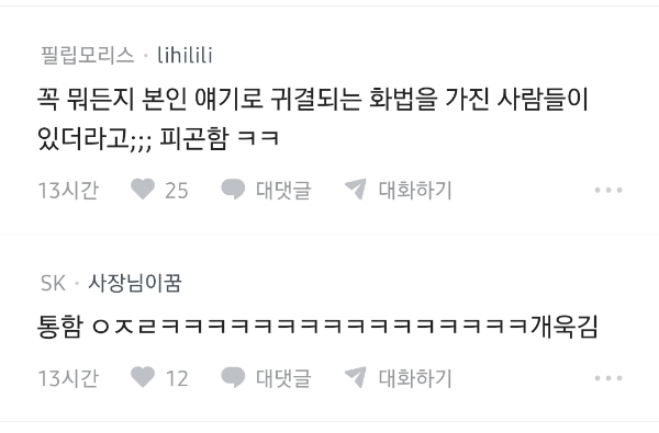 작성자매기 작성시간 26.01.01 심한 사람들이 있음..뭔 얘기만 하면 나는~어쩌구 나도~어쩌고로 시작