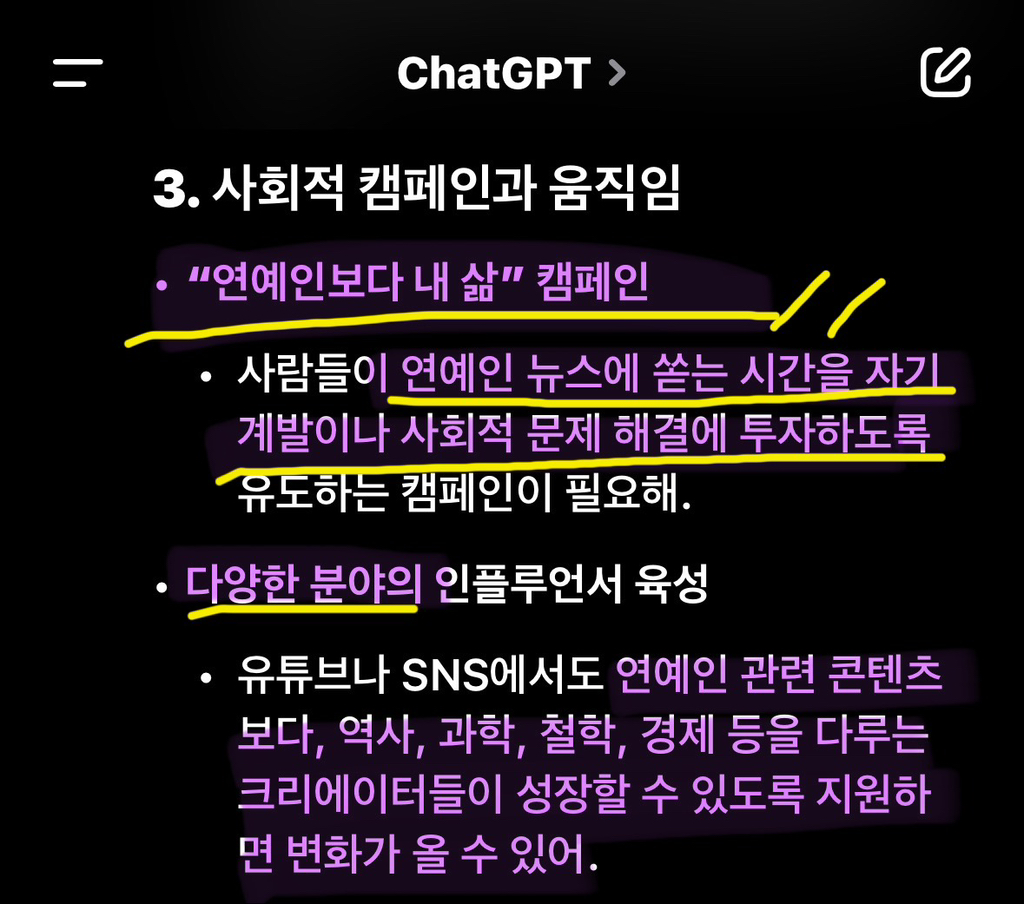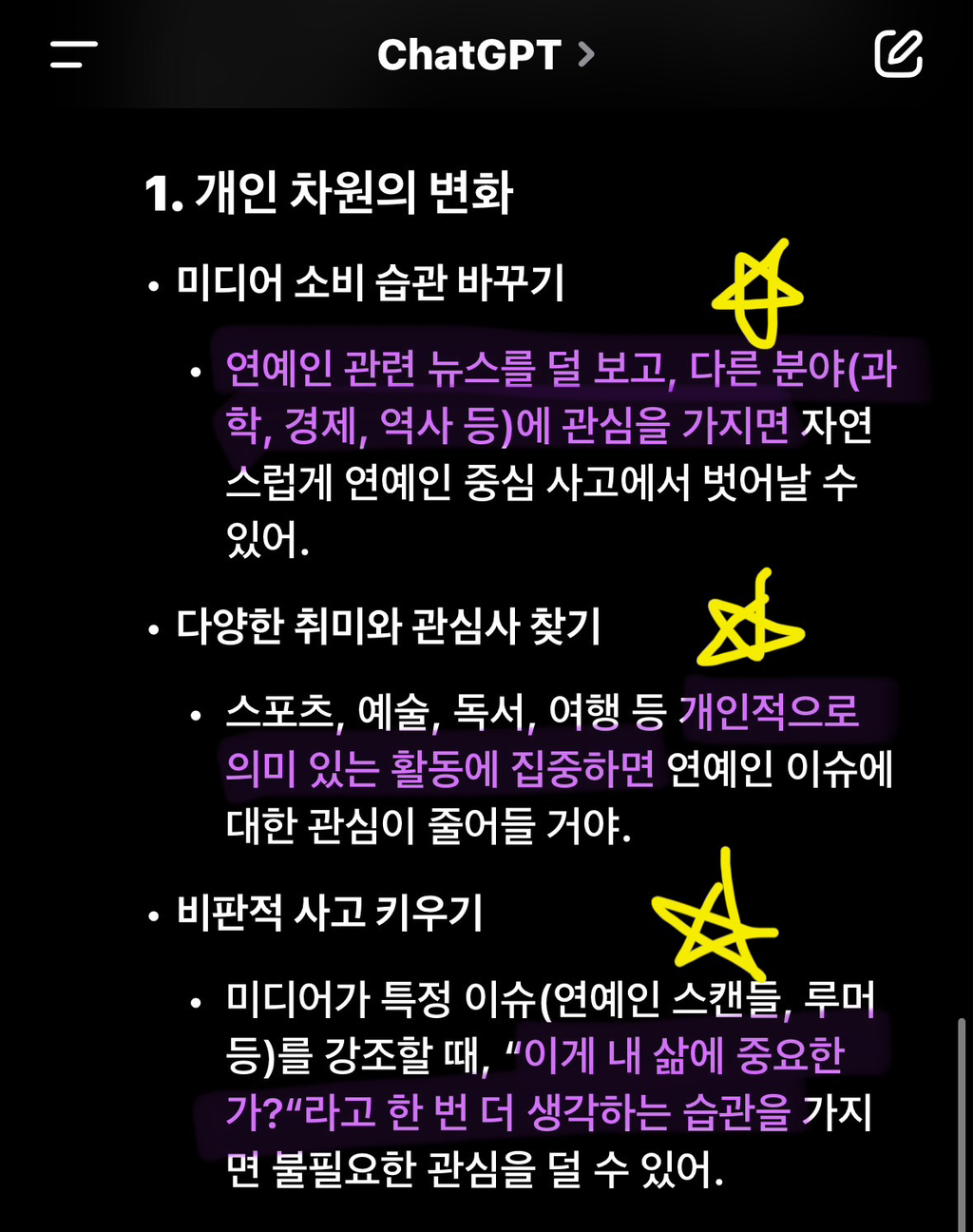 내 삶에 집중하기!!!!연예인 이외에 내가 집중할 수 있는 관심사를 찾아보자!! 그리고 우리의 관심이 필요한 분야는 연예인 말고 너무나도 많다는거 잊지말자~