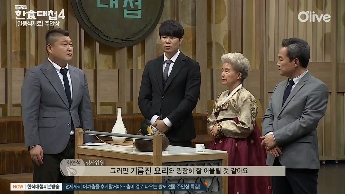 술 따르는 걸 유심히 보는 3명의 심사위원