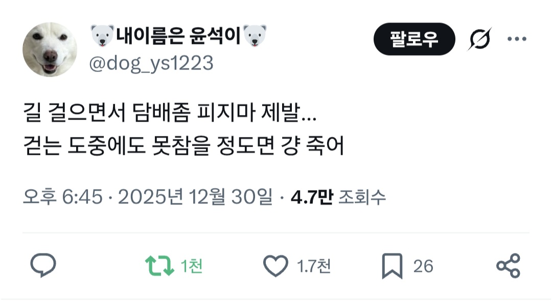 [기타]길 걸으면서 담배좀 피지마 제발...twt 작성자냥냥펀치°|작성시간25.12.31|조회수13,293 목록 댓글 49 글자크기 작게가 글자크기 크게가 출처: https://x.com/dog_ys1223/status/2005938336796692781?s=20 다음검색 현재 게시글 추가 기능 열기 북마크 공유하기 신고 센터로 신고 댓글 댓글 49 댓글쓰기 답글쓰기 댓글 리스트 작성자똑똑똑아랫집입니다 | 작성시간 25.12.31 제발 죽어... 작성자설탕도넛 | 작성시간 25.12.31 담배피는 인간들 진짜 싹다 이기적임 지밖에 모르고 참을성도 없는 짐승들같음 작성자홈런볼다섯개도가능 | 작성시간 25.12.31 ㄹㅇ...그거 못참는데 어케 사냐..ㅅㅂ걍 죽어.... 작성자파파팟포포폿 | 작성시간 25.12.31 싹 다 그 성별 작성자ESFP-T | 작성시간 25.12.31 홍대 이런 데 빼고다 고추들임 진짜 다 죽었으면 좋겠어 댓글 전체보기