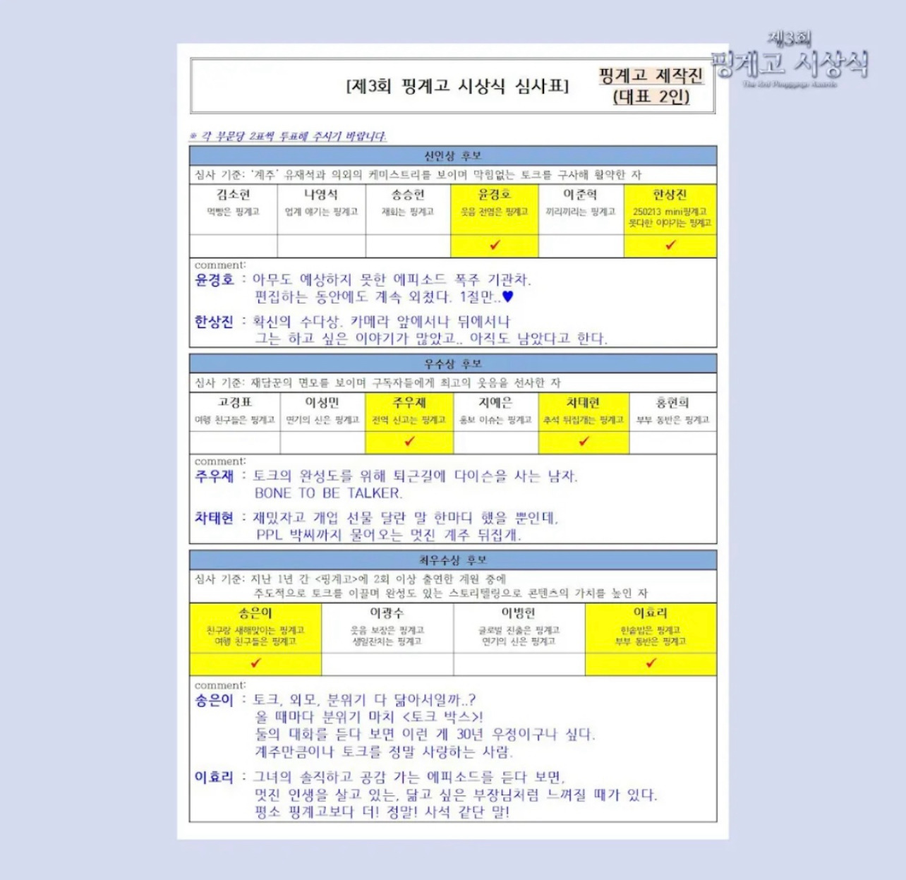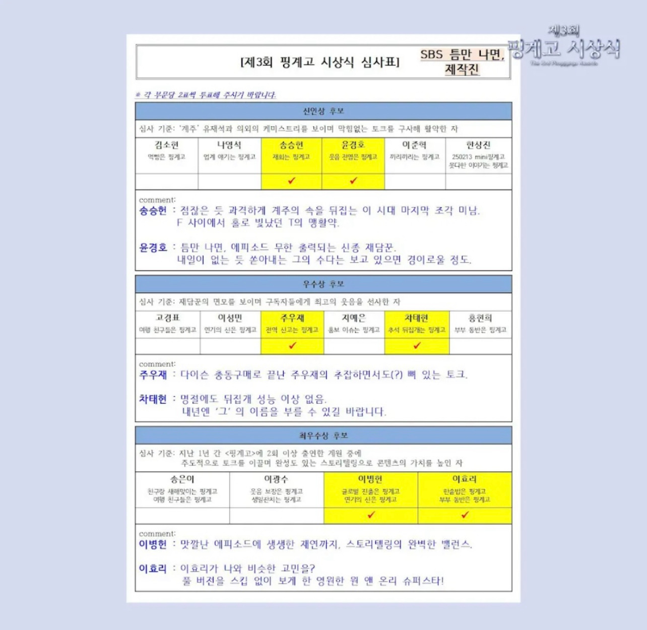 최우수상 후보는 한해동안 2회이상 대상후보는 3회이상 출연을 기준으로 정해놓음