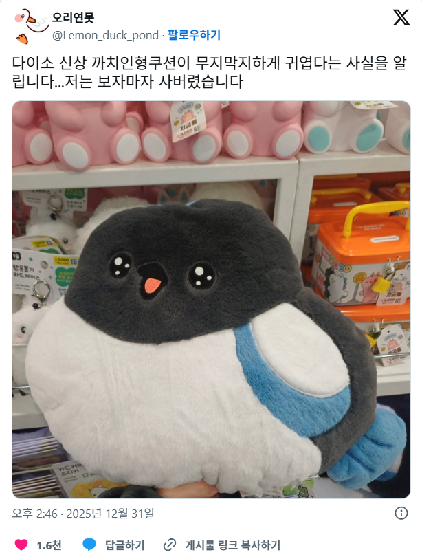 [흥미돋]다이소 신상 까치인형쿠션이 무지막지하게 귀엽다는 사실을 알립니다 작성자가나다라가나디|작성시간25.12.31|조회수38,802 목록 댓글 34 글자크기 작게가 글자크기 크게가 출처: https://theqoo.net/square/4046835956 눈이 초롱초롱 빛남 다음검색 현재 게시글 추가 기능 열기 북마크 공유하기 신고 센터로 신고 댓글 댓글 34 댓글쓰기 답글쓰기 댓글 리스트 작성자떤스타일 | 작성시간 25.12.31 난 오목눈이샀오 이미지 확대 답댓글 작성자가나다라가나디 작성자 본인 여부 작성자 | 작성시간 26.01.01 헐 귀여워 ㅠㅠㅠㅠ 작성자씨보레 | 작성시간 25.12.31 앗 너무 귀여워 작성자알수없는사용자 | 작성시간 25.12.31 키링으로 만들아줘 작성자그러거나말거나링 | 작성시간 25.12.31 세상에나...! 댓글 전체보기