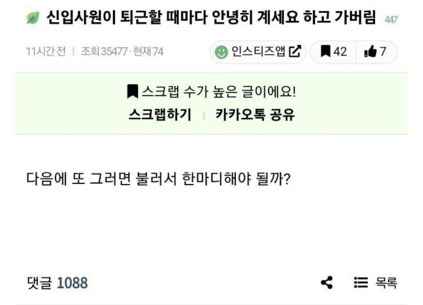 작성자쟝포니 작성시간 26.01.01 하 나도 신입 때 절대 안녕히계세요 안해야지 했는데 나도 모르게 두세번 나왔엌ㅋㅋㅋㅋㅋ 진짜 수치