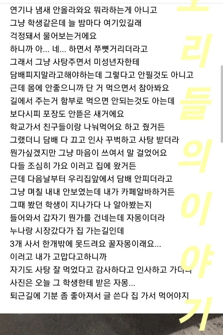 [스크랩] [흥미돋]애기들이 자꾸 우리 집 앞에서 담배피길래 사탕줬는데 자몽 받았어 작성자라이도|작성시간26.01.01|조회수9,757 목록 댓글 7 글자크기 작게가 글자크기 크게가 출처 : https://theqoo.net/index.php?mid=square&document_srl=2796179229 다음검색 스크랩 원문 : *여성시대* 차분한 20대들의 알흠다운 공간 현재 게시글 추가 기능 열기 북마크 공유하기 신고 센터로 신고 댓글 댓글 7 댓글쓰기 답글쓰기 댓글 리스트 작성자실없는매실 | 작성시간 26.01.01 새해 첫 쩌리글인데 마음 따숩다 작성자호이찐 | 작성시간 26.01.01 그냥 사회는 이런사람들때문에 굴러가는거같아 악하게태어난사람도있겠지만 착하게태어난사람도있고 ㅠㅠㅠ 작성자북박북박쓰 | 작성시간 26.01.01 이게 바로 사람사는 냄새. 인류애 충전이다! 작성자Fix you | 작성시간 26.01.01 따숩다.. 따수워 마음들이 다 따수워 작성자제발그만먹어 | 작성시간 26.01.01 멋진 사람.... 댓글 전체보기