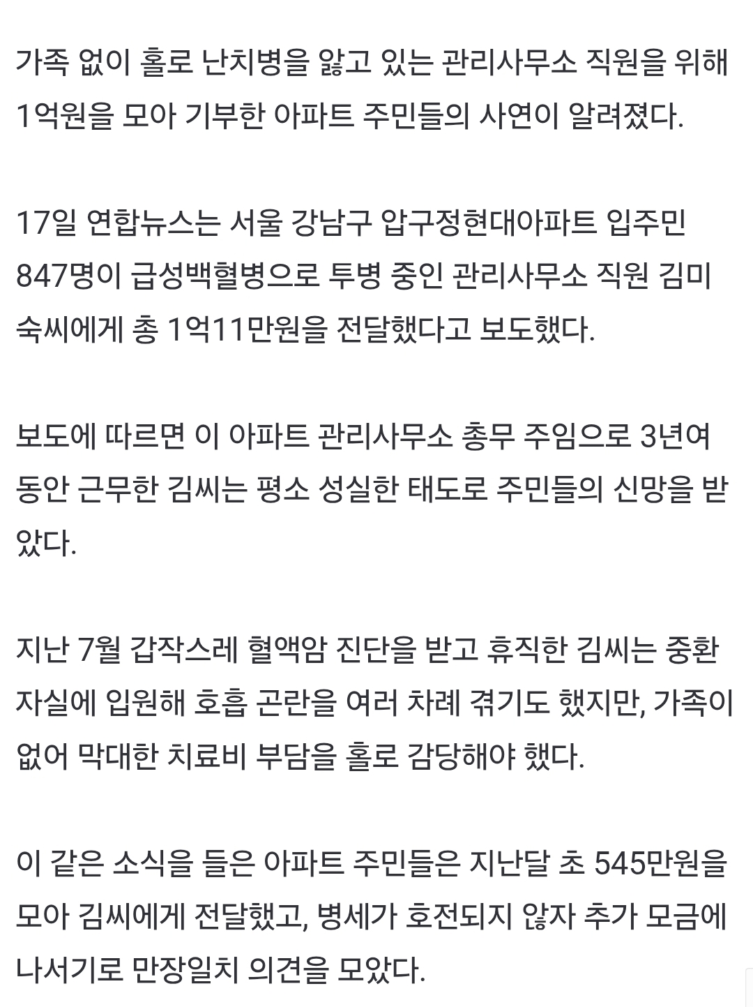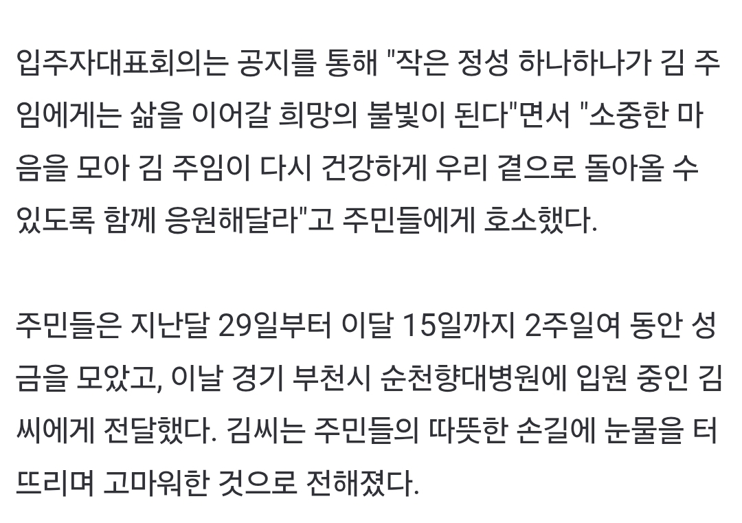 [스크랩] [흥미돋]"'백혈병' 투병 직원 도와주자"…1억원 모은 아파트 주민들 작성자라이도|작성시간26.01.01|조회수3,417 목록 댓글 10 글자크기 작게가 글자크기 크게가 출처: 더쿠 - "'백혈병' 투병 직원 도와주자"…1억원 모은 아파트 주민들 https://share.google/AZVLqb4R10oYltLkV 다음검색 스크랩 원문 : *여성시대* 차분한 20대들의 알흠다운 공간 현재 게시글 추가 기능 열기 북마크 공유하기 신고 센터로 신고 댓글 댓글 10 댓글쓰기 답글쓰기 댓글 리스트 작성자니어by유 | 작성시간 26.01.01 마음도 부자♡♡♡ 작성자앵재기뤼~ | 작성시간 26.01.01 새해부터 눈물나게하는구먼 ㅠ 쾌차하세요ㅜㅜ 작성자gdddg | 작성시간 26.01.01 눈물다 다들 따뜻하다 마음이 정말 작성자식인친칠라행정기계 | 작성시간 26.01.01 대한민국 최고부자아파트에서 선행 하니 왜케 보기 좋냐 다들 따라하자 작성자CardiB | 작성시간 26.01.01 마음도 따뜻한 진짜 부자들이시군 얼른 건강해지셨음 좋겠다 댓글 전체보기