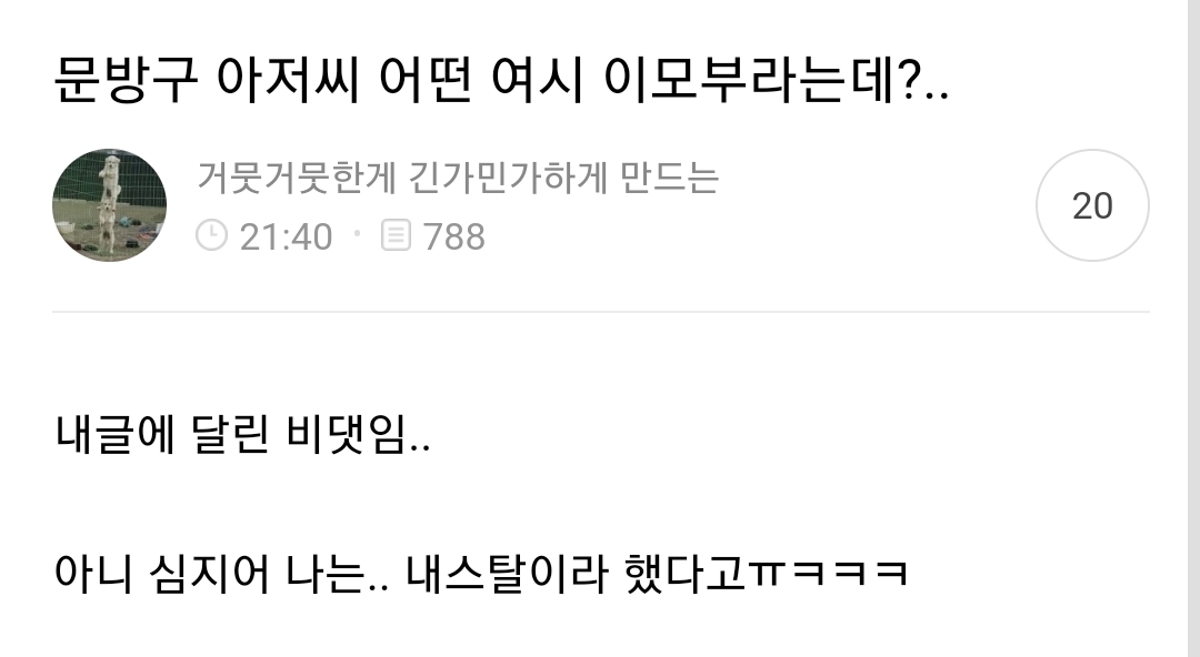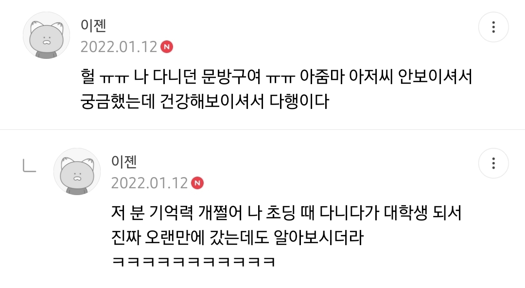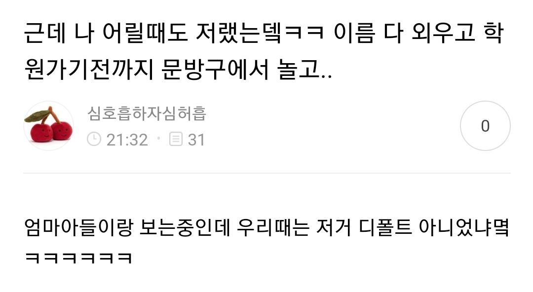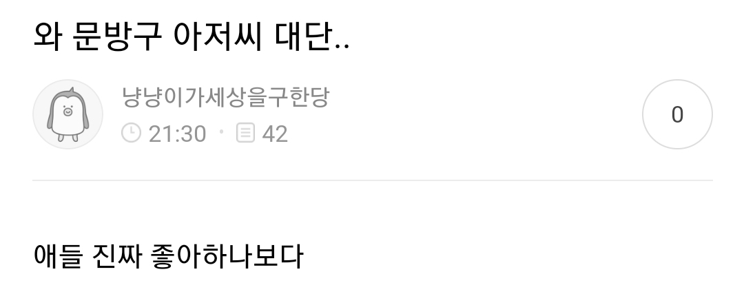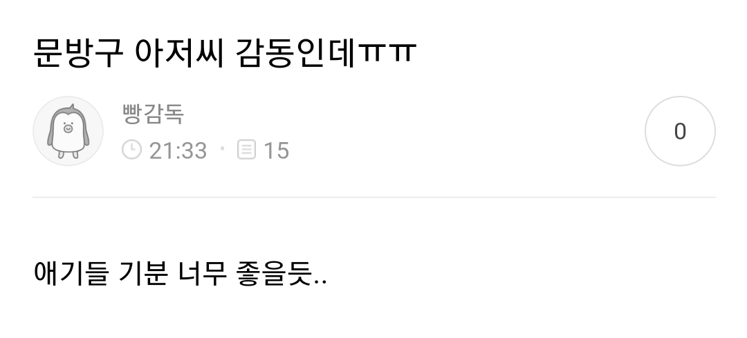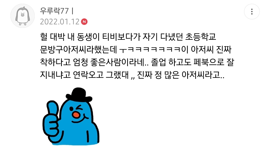 작성자지옥에서온메갈 작성시간 26.01.01 요즘 학교앞에 무인문방구 많아지던데… 저렇게 따뜻함 어른이 있는게 아이들에게 더 좋겠다 나도 학교다닐때 학교앞 문방구 할아버지 아직도 기억나는데… 분식집 떡볶이 언니두..