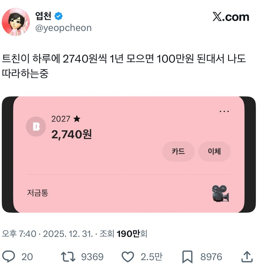 [흥미돋]지금부터 1년 모으면 100만원 작성자예준이 효자 되세요|작성시간26.01.01|조회수36,272 목록 댓글 30 글자크기 작게가 글자크기 크게가 출처: https://x.com/yeopcheon/status/2006314568046498118?s=46&t가보자고 다음검색 현재 게시글 추가 기능 열기 북마크 공유하기 신고 센터로 신고 댓글 댓글 30 댓글쓰기 답글쓰기 댓글 리스트 작성자이뤄지는부적 | 작성시간 26.01.01 와시작 작성자내가하고싶은거다해낼것 | 작성시간 26.01.01 와 카뱅으로 가입완 작성자과일짱조아 | 작성시간 26.01.01 나도해야지 작성자우왕~ 행복해 | 작성시간 26.01.01 와,, 당장해야지 작성자가다나라마바사아 | 작성시간 26.01.01 오오 손민수완. 댓글 전체보기