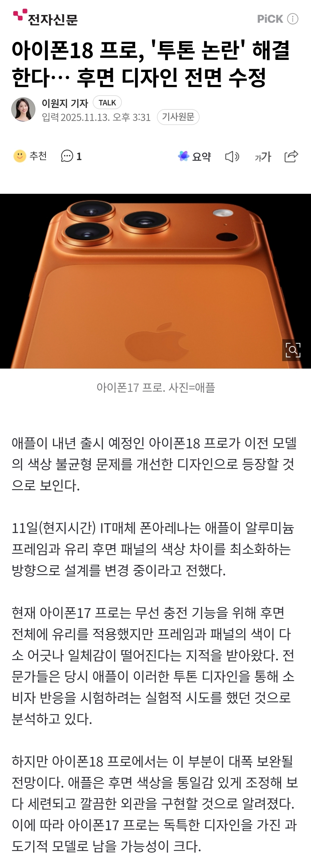 [여시뉴스데스크]아이폰18 프로, '투톤 논란' 해결한다… 후면 디자인 전면 수정 작성자돈주라줘|작성시간26.01.01|조회수34,951 목록 댓글 46 글자크기 작게가 글자크기 크게가 출처: https://n.news.naver.com/article/030/0003370044?sid=104아이폰18 프로, '투톤 논란' 해결한다… 후면 디자인 전면 수정애플이 내년 출시 예정인 아이폰18 프로가 이전 모델의 색상 불균형 문제를 개선한 디자인으로 등장할 것으로 보인다. 11일(현지시간) IT매체 폰아레나는 애플이 알루미늄 프레임과 유리 후면 패n.news.naver.com유일한 투톤모델은 아이폰17프로가 됨 다음검색 현재 게시글 추가 기능 열기 북마크 공유하기 신고 센터로 신고 댓글 댓글 46 댓글쓰기 답글쓰기 댓글 리스트 작성자얼음별대탐험 | 작성시간 26.01.01 투톤때매 계속 망설이고있었는데 ㅋㅋ 존버간다 12프로야 버텨줘 작성자애고고곡 | 작성시간 26.01.01 난 꽤 맘에 들어 이미지 확대 작성자까꾸루 | 작성시간 26.01.01 이미 익숙해짐 예쁜걸요 작성자디카페인없는에스프레소 | 작성시간 26.01.01 투톤이 문제인거같지…? 작성자얼짱소금빵 | 작성시간 26.01.02 아이씹할 샛기덜아 댓글 전체보기