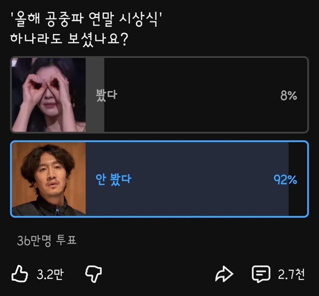 [흥미돋]요즘 연말 공중파 시상식 위치 작성자비오는 여름날|작성시간26.01.01|조회수168,856 목록 댓글 573 글자크기 작게가 글자크기 크게가 출처: http://youtube.com/post/UgkxAddzBLxWyKREAAgoB0SB1YApTItk6b4x?si=YPh60t8FpGpWoUcT주식초등학교님의 설문조사'올해 공중파 연말 시상식' 하나라도 보셨나요?www.youtube.com나만 하나도 안봤나 했는데대체로 안보네 다음검색 현재 게시글 추가 기능 열기 북마크 공유하기 신고 센터로 신고 댓글 댓글 573 댓글쓰기 답글쓰기 댓글 리스트 작성자히힛힛힛히 | 작성시간 26.01.07 다안봤는데 핑계고시상식은봄 작성자무말랭이차 | 작성시간 26.01.08 진짜 하나도 안궁금해 작성자고래를 타고 떠나는 여행 | 작성시간 26.01.08 안 봤어ㅋㅋ 작성자핑크파자마 | 작성시간 26.01.09 안본지 꽤됨 작성자야모른척하고놀자 | 작성시간 26.01.10 아얘안봤고!!!!!! 핑계고 풀로다봄 ㅠㅠㅠㅠ 댓글 전체보기