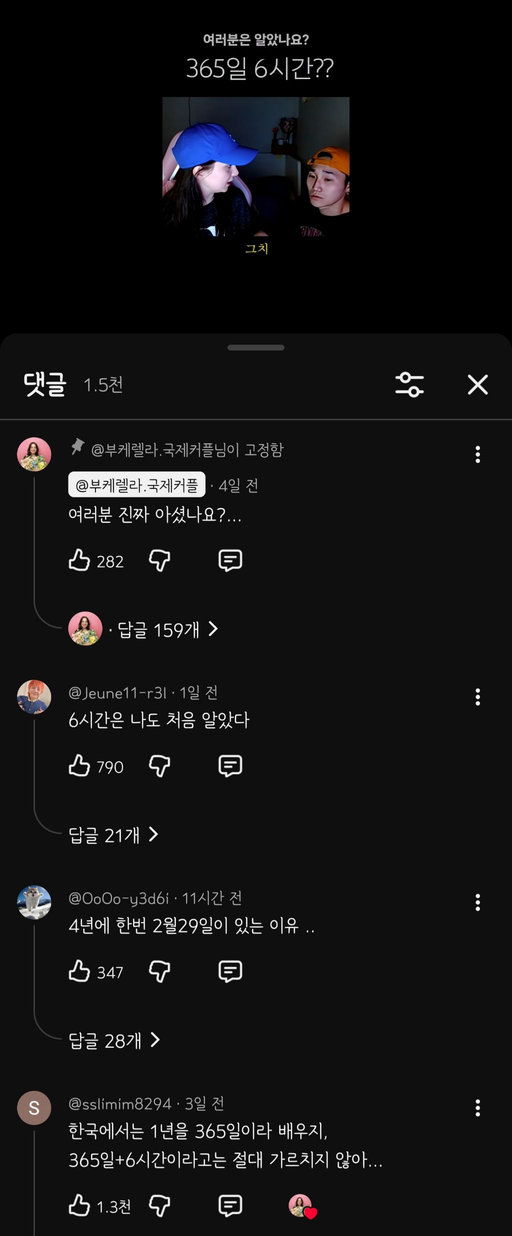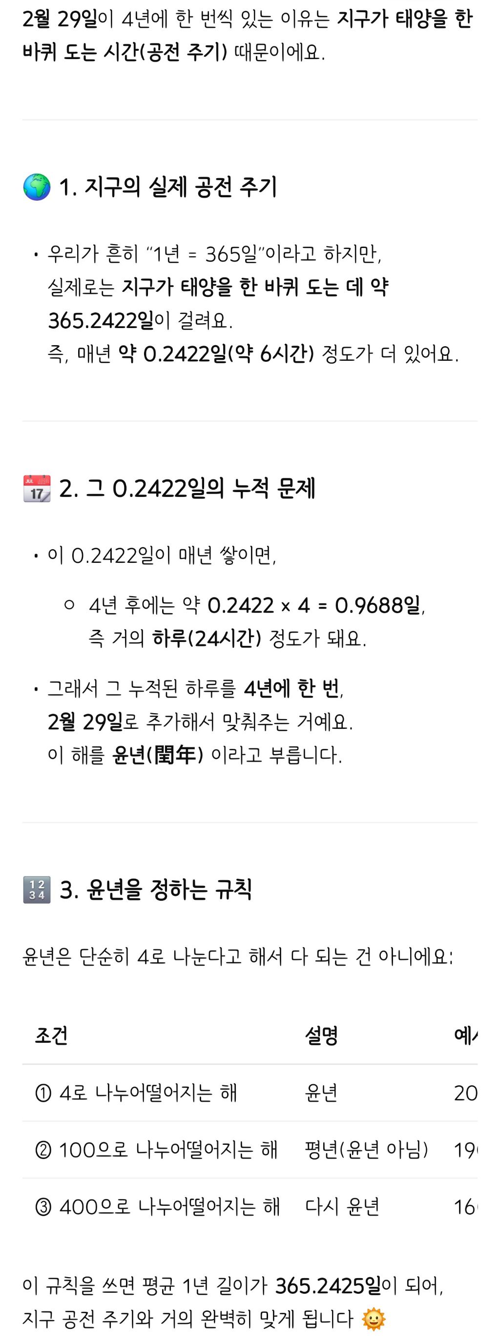[스크랩] [흥미돋]1년이 365일 6시간인거 알았다 vs 몰랐다 작성자lucky girl|작성시간26.01.01|조회수19,828 목록 댓글 21 글자크기 작게가 글자크기 크게가 출처: https://youtu.be/nAE_f2W1I78?si=7sifH6_0LUBEd_-e나도 2월 29일이 4년에 한번씩 있다만 알고있었어서 저 쇼츠 보고 아..! 하게됨 다음검색 스크랩 원문 : *여성시대* 차분한 20대들의 알흠다운 공간 현재 게시글 추가 기능 열기 북마크 공유하기 신고 센터로 신고 댓글 댓글 21 댓글쓰기 답글쓰기 댓글 리스트 작성자앤믹스 설윤 | 작성시간 26.01.02 알았어..! 작성자로우슈거페퍼민트 | 작성시간 26.01.02 그냥 365일 6시간으로 살면 안되는걸까??? 마지막 6시간은 좀 놀게 작성자슈퍼난투전 | 작성시간 26.01.02 윤년이라고만 알고 살았는데 이렇게 쉽게 한줄로 설명되는거였다니... 작성자별들을이어 | 작성시간 26.01.02 윤달이 잇는이유인가 작성자딥치즈 베이컨 포테이토 | 작성시간 26.01.02 아그래서...!!!!! 댓글 전체보기
