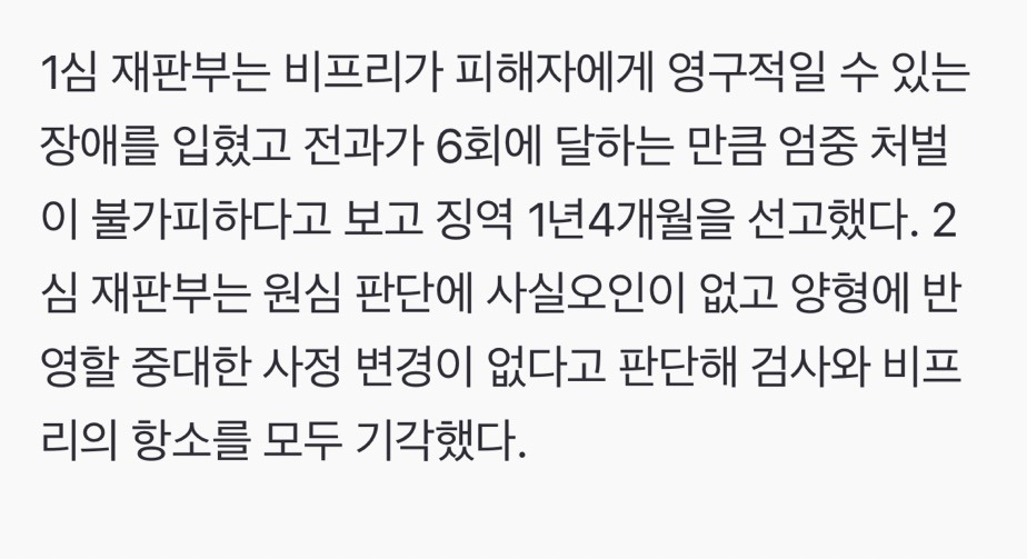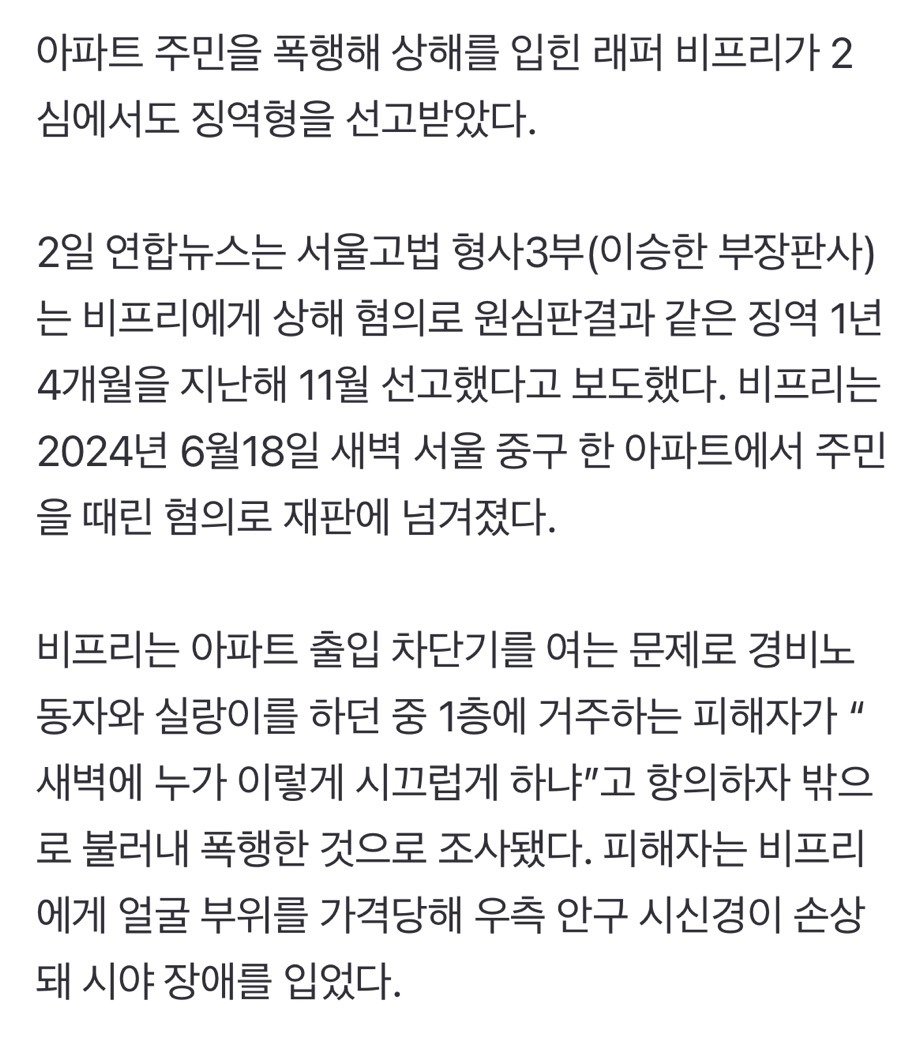 [여시뉴스데스크]주민 폭행해 시신경 손상···래퍼 비프리, 2심도 징역형 작성자배구노예|작성시간26.01.02|조회수17,659 목록 댓글 19 글자크기 작게가 글자크기 크게가 출처: https://n.news.naver.com/article/032/0003418992?sid=102주민 폭행해 시신경 손상···래퍼 비프리, 2심도 징역형아파트 주민을 폭행해 상해를 입힌 래퍼 비프리가 2심에서도 징역형을 선고받았다. 2일 연합뉴스는 서울고법 형사3부(이승한 부장판사)는 비프리에게 상해 혐의로 원심판결과 같은 징역 1년4개n.news.naver.com 다음검색 현재 게시글 추가 기능 열기 북마크 공유하기 신고 센터로 신고 댓글 댓글 19 댓글쓰기 답글쓰기 댓글 리스트 작성자루류규 | 작성시간 26.01.02 미쳤네 전과????ㅅㅂ 작성자김연경X나X안산 | 작성시간 26.01.02 미친 새끼네 작성자고냥이냥 | 작성시간 26.01.02 1년 4개월? 사람 인생 망쳐놓고 판사도 돌았나 작성자Grok | 작성시간 26.01.02 얼씨구 인생 막장이네 전과6범이랜다 작성자금별맥주 | 작성시간 26.01.03 판사 니 눈 못써도 1년4개월 때리냐 댓글 전체보기