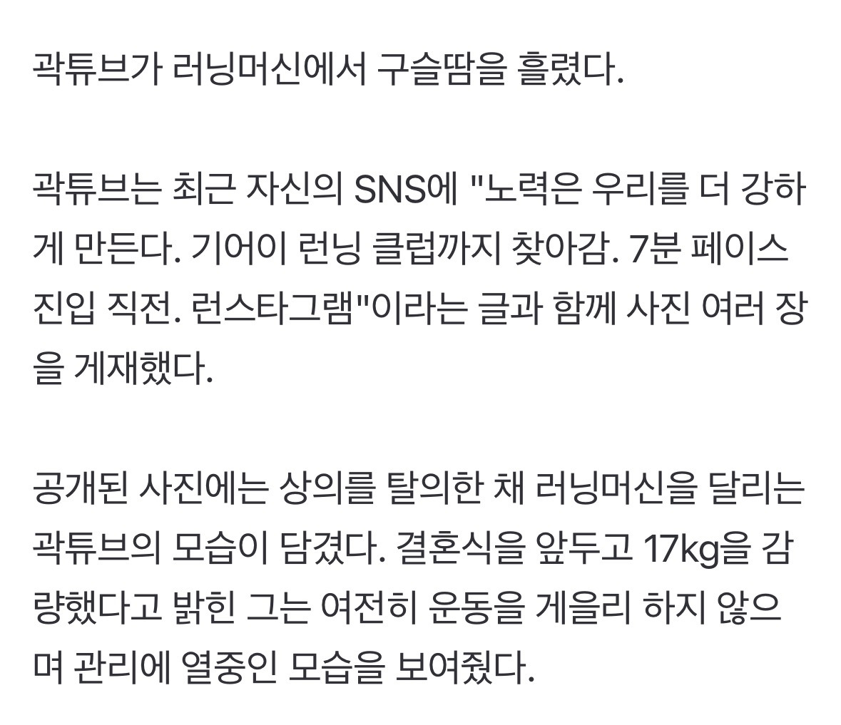 [여시뉴스데스크]‘17kg 감량’ 곽튜브, ‘이 운동’으로 체지방 쏙 빠졌나? 상의 탈의 자신감 작성자Sunmoonstar02|작성시간26.01.02|조회수42,347 목록 댓글 244 글자크기 작게가 글자크기 크게가 출처: https://n.news.naver.com/article/296/0000096215‘17kg 감량’ 곽튜브, ‘이 운동’으로 체지방 쏙 빠졌나? 상의 탈의 자신감곽튜브가 러닝머신에서 구슬땀을 흘렸다. 곽튜브는 최근 자신의 SNS에 "노력은 우리를 더 강하게 만든다. 기어이 런닝 클럽까지 찾아감. 7분 페이스 진입 직전. 런스타그램"이라는 글과 함께 사진n.news.naver.com 다음검색 현재 게시글 추가 기능 열기 북마크 공유하기 신고 센터로 신고 댓글 댓글 244 댓글쓰기 답글쓰기 댓글 리스트 작성자갼장게장 | 작성시간 26.01.03 우리 착하게 살았는데 왜 우리힌테 새해벽두부타 왜이래 ㅠ 작성자가쓔 | 작성시간 26.01.03 아 자아존나커졌나봐....... 작성자버럭핑 | 작성시간 26.01.03 아 시발 작성자광안리뷰 | 작성시간 26.01.03 아… 결혼하고 뭔 자신감이 생긴건가… 와 진짜… 괴롭다 작성자고기사랑 | 작성시간 26.01.04 귀한 나에게 왜 이런 시련이 댓글 전체보기