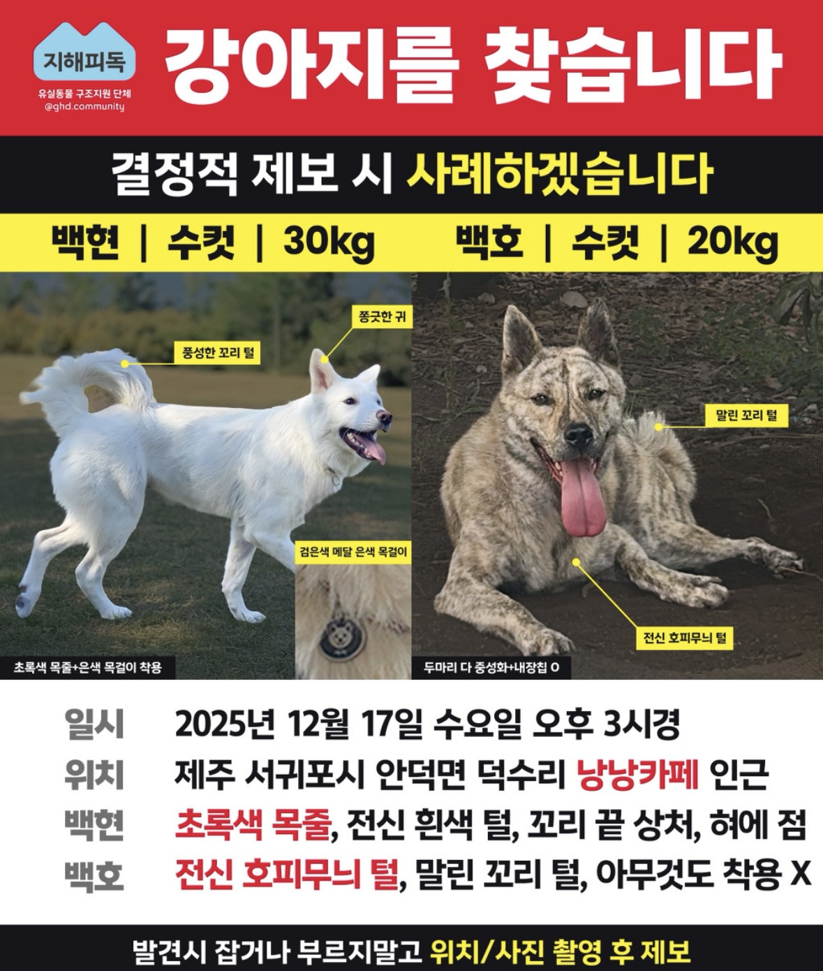 2025년 12월 17일 오후 3시경 제주특별자치도 서귀포시 안덕면 덕수리 부근에서 강아지들을 잃어버렸습니다.