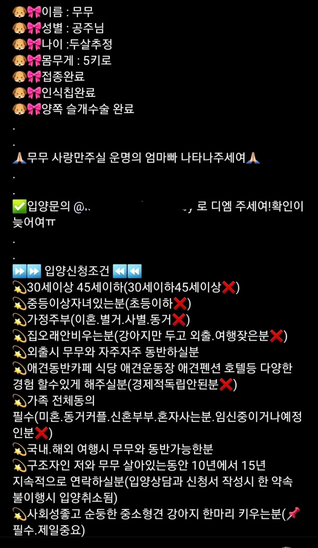 [기타]강아지 고양이 입양 조건 과하다 vs 아니다 작성자ririri|작성시간26.01.02|조회수21,937 목록 댓글 229 글자크기 작게가 글자크기 크게가 출처: 여성시대 ririri 다음검색 현재 게시글 추가 기능 열기 북마크 공유하기 신고 센터로 신고 댓글 댓글 229 댓글쓰기 답글쓰기 댓글 리스트 작성자랄라라랄라랄 | 작성시간 26.01.04 연락 10년에서 완전 과함 작성자강아지 고양이 사랑해 | 작성시간 26.01.04 과해….. 작성자HEARTS2HEARTS | 작성시간 26.01.04 잘못 누름 개과해 작성자포로슛팟팟팟 | 작성시간 26.01.04 읽는데 벌써 숨막혀 연락 뭐야 작성자하준 | 작성시간 26.01.04 본인이 키우시길~^^ 댓글 전체보기