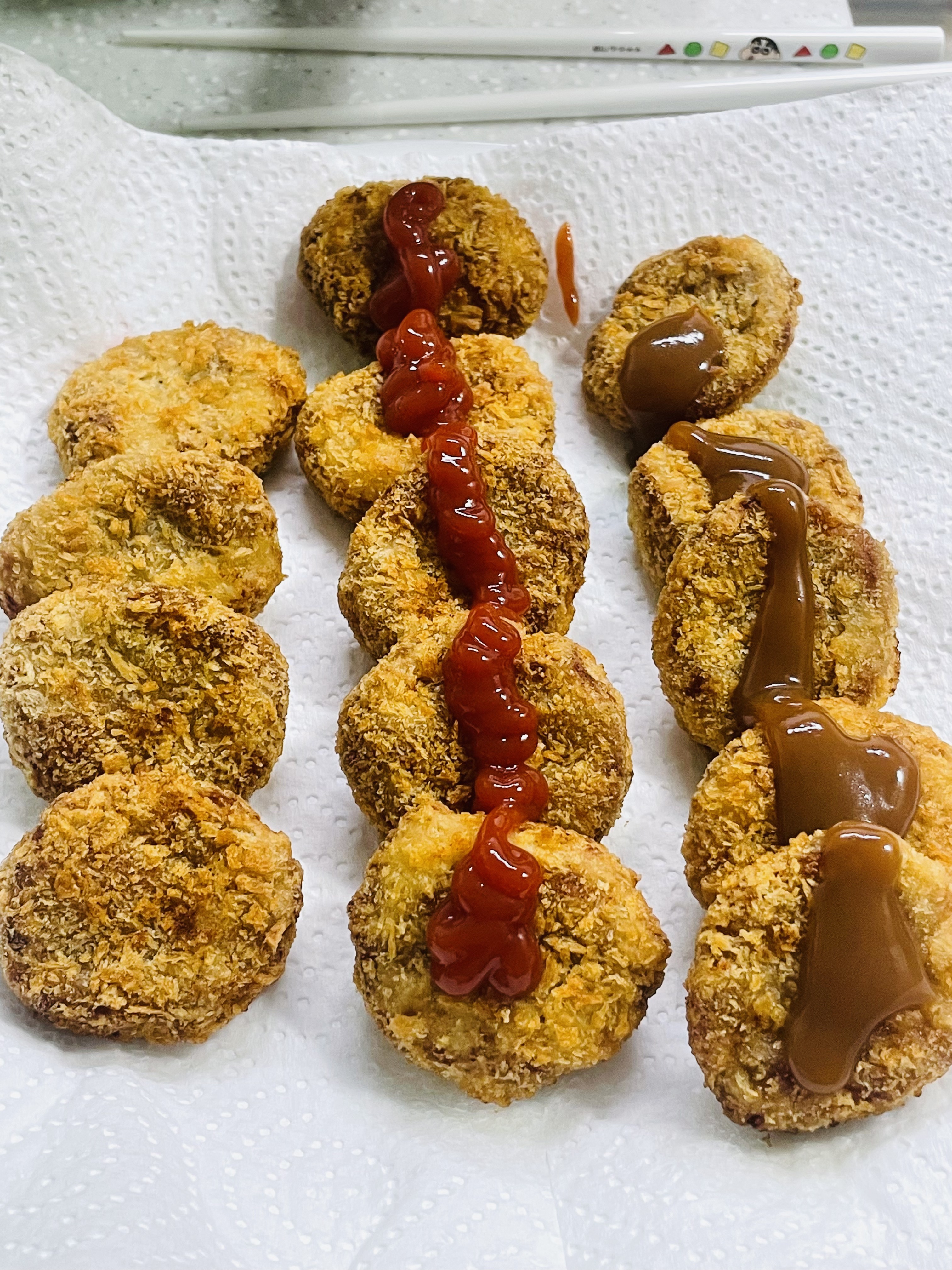꼬마돈까스 구워서 케찹과 돈까스 소스에 뿌먹