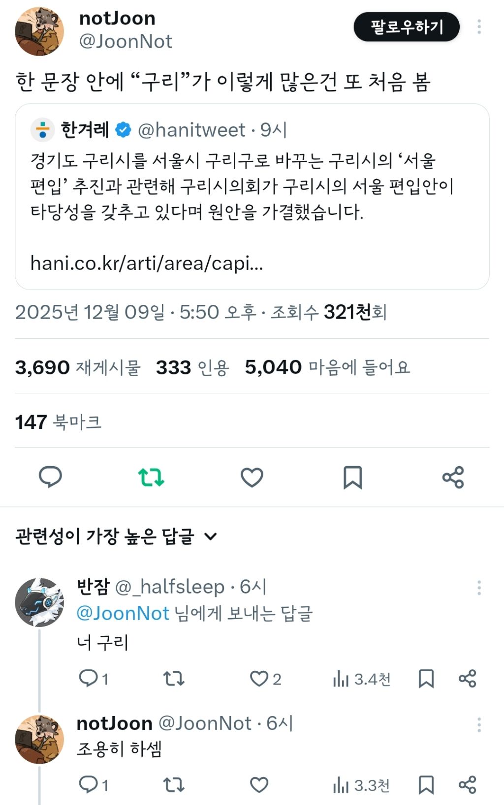 [스크랩] [기타]한 문장 안에 '구리'가 이렇게 많은건 또 처음 봄 작성자nivic|작성시간26.01.04|조회수54,234 목록 댓글 32 글자크기 작게가 글자크기 크게가 출처: 여성시대 대문자INTP경기도 구리시를 서울시 구리구로 바꾸는 구리시의 ‘서울 편입’ 추진과 관련해 구리시의회가 구리시의 서울 편입안이 타당성을 갖추고 있다며 원안을 가결했습니다.문제시 쭈구리됨 다음검색 스크랩 원문 : *여성시대* 차분한 20대들의 알흠다운 공간 현재 게시글 추가 기능 열기 북마크 공유하기 신고 센터로 신고 댓글 댓글 32 댓글쓰기 답글쓰기 댓글 리스트 작성자하이마마 | 작성시간 26.01.04 동구리오 작성자불고기백반 | 작성시간 26.01.04 구리구리구리구리 가위바위보! 작성자((본인닉네임) | 작성시간 26.01.04 구리구리 멍텅구리 작성자happyhappyhappy | 작성시간 26.01.05 쇠똥구리구리구리양동구리구리 배앵뱅 작성자욕 줄이기 | 작성시간 26.01.05 구리에다가 쓰레기장 만드려나보네구리구리한 냄새 날 듯~ 댓글 전체보기