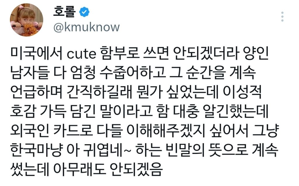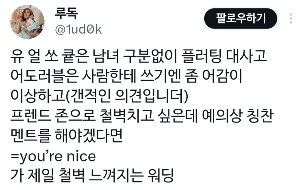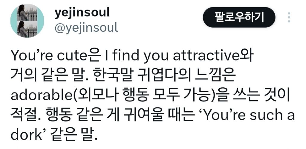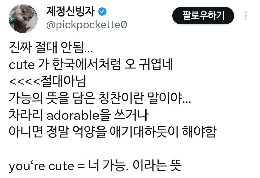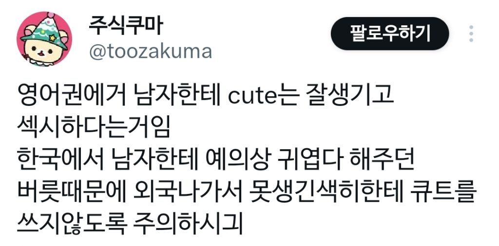 작성자앵재기뤼~ 작성시간 26.01.05 Cute 남발하는 습관있는데 외국나가면 조심해여겠네