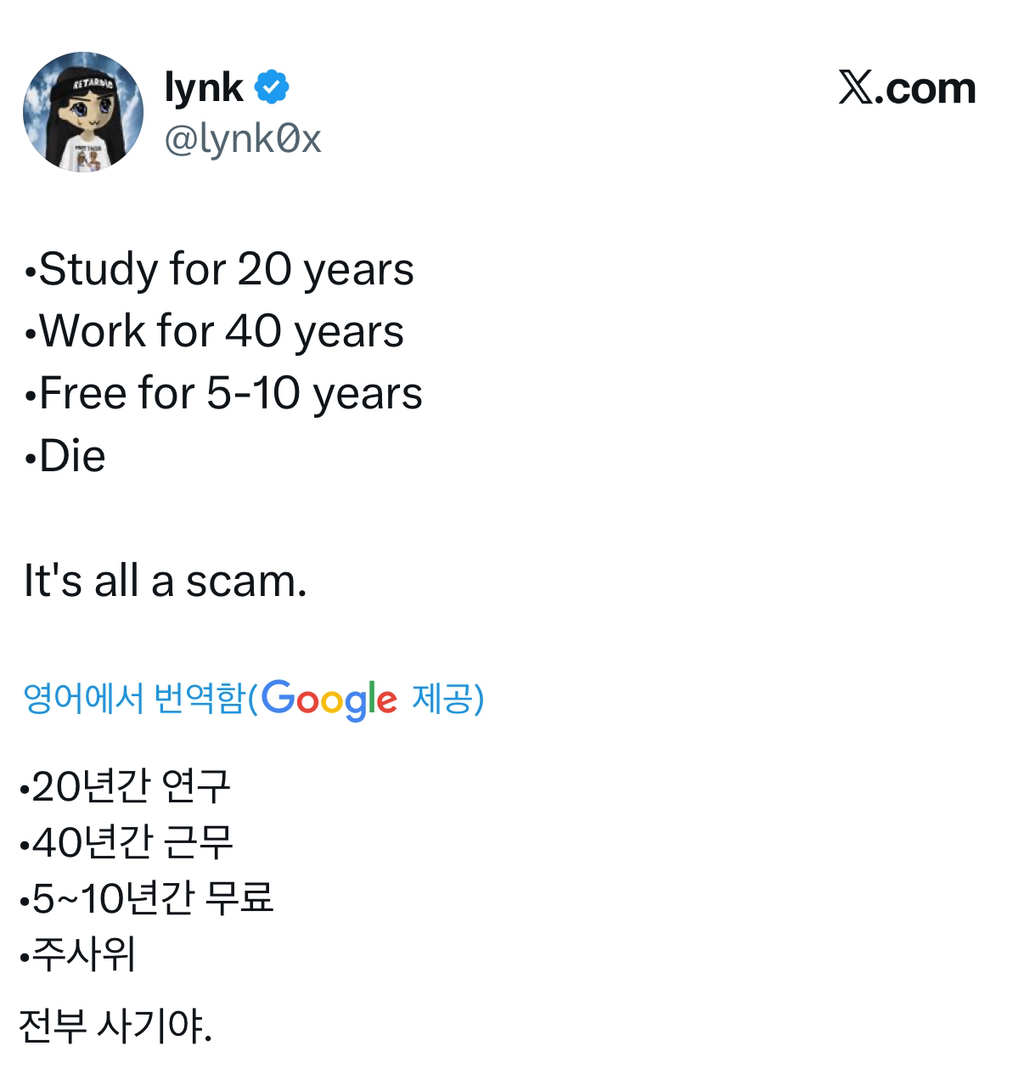 [기타]트위터에서 말하는 인생 작성자2026년행운은나에게로|작성시간26.01.04|조회수8,205 목록 댓글 3 글자크기 작게가 글자크기 크게가 출처: https://x.com/lynk0x/status/2007501711901110549?s=4620년간 공부40년간 일5~10년 자유죽음 다음검색 현재 게시글 추가 기능 열기 북마크 공유하기 신고 센터로 신고 댓글 댓글 3 댓글쓰기 답글쓰기 댓글 리스트 작성자햄북스딱스햄부기온앤온을낋여오너라 | 작성시간 26.01.04 진짜 일이년만 직장생활해도 미쳐버릴것같은데 이걸 몇십년동안 지속하는 삶이 일반적인 삶이라는게 그냥 믿을수가없음 ;;; ㅠㅠ 작성자그대들은그뭐다 | 작성시간 26.01.04 주사위 뻘하게웃기닼ㅋㅋ 작성자익스펜시브 페트롤리움 | 작성시간 26.01.05 인생은 진짜 뭘까.. 댓글 전체보기