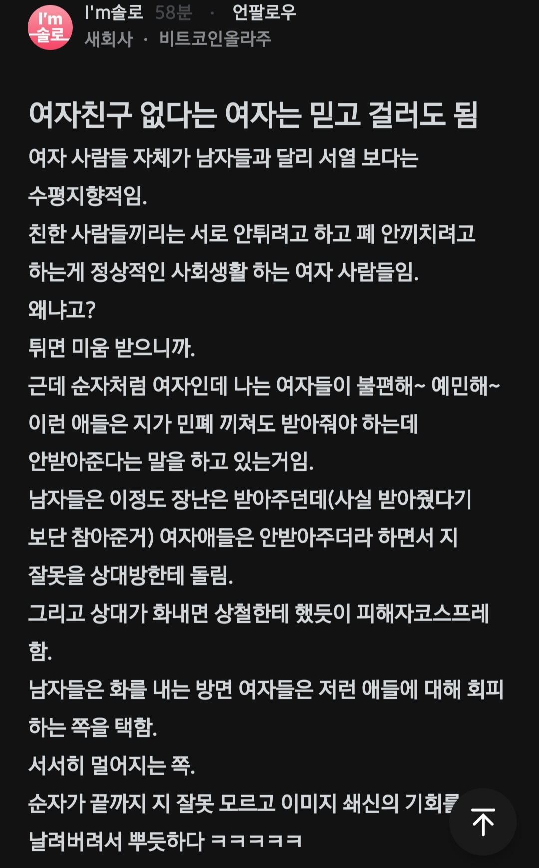 작성자삼성전자이재용회장이내아빠였으면좋 작성시간 26.01.05 난 기집애, 가시나들이랑 안맞아 라고 말하던 사람 제가 겪어봤어요. 피하세요제발 ㅠㅠ